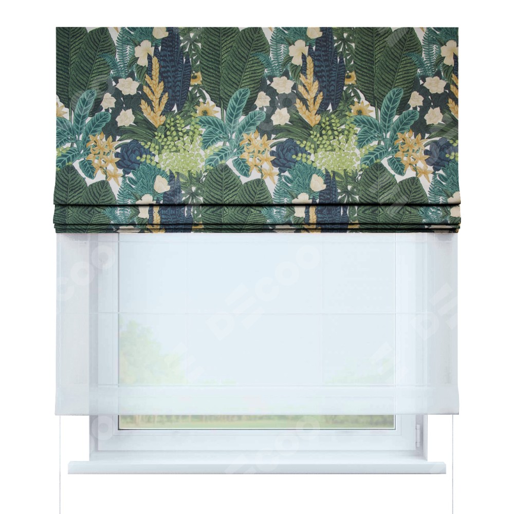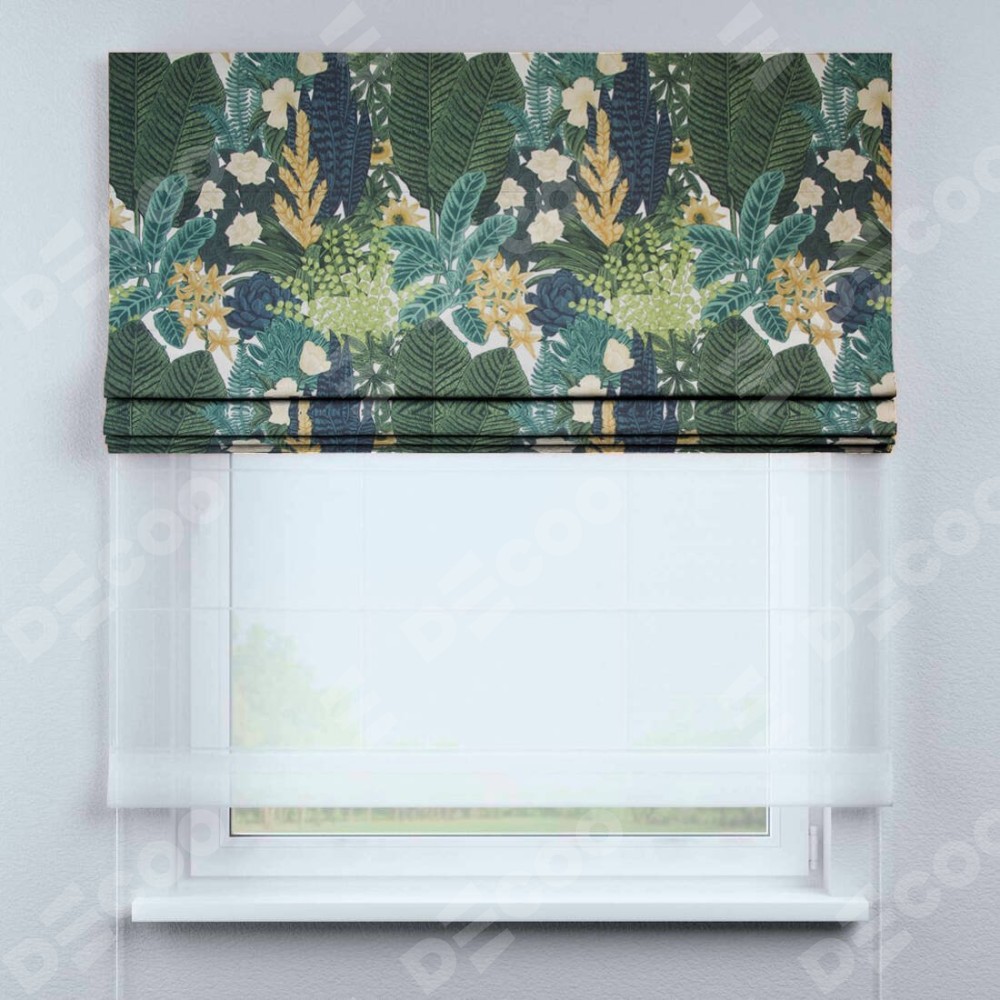 Римская штора день-ночь производителя «Cortin», используется для проёма, пошита из двух полотен, с лицевой стороны «Джунгли», вторая ткань тюль (по стандарту комплектуется тюль белого цвета артикул V-01). Имеет универсальный механизм и подходит для монтажа: на потолок, на стену и в нишу.