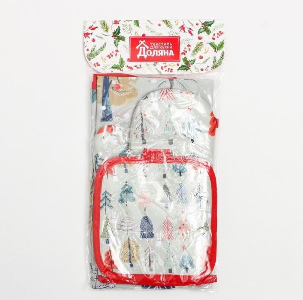 Кухонный новогодний набор Доляна«Новогодний лес» фартук 70х80см, прихватка 17х17см, варежка-прихватка 26х16см