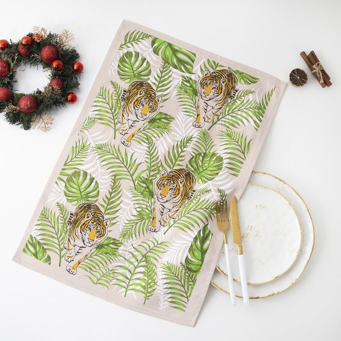 Полотенце 39×60 см, Тигр в листьях, бежевый, 200 гр/м хл