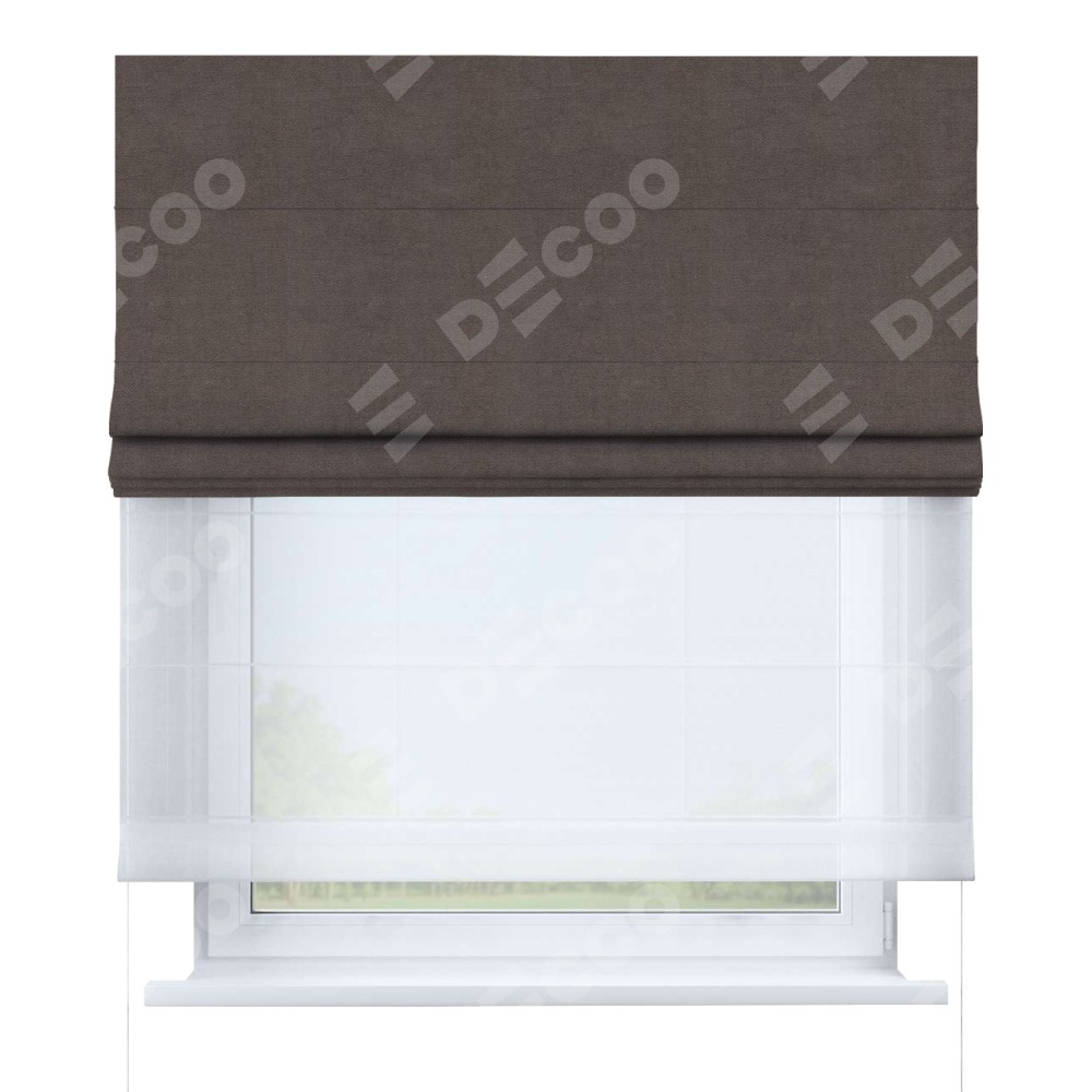 Римская штора день-ночь производителя «Cortin», используется для проёма, пошита из двух полотен, с лицевой стороны вельвет коричневый артикул 14135, вторая ткань тюль (по стандарту комплектуется тюль белого цвета артикул V-01). Имеет универсальный механизм и подходит для монтажа: на потолок, на стену и в нишу.