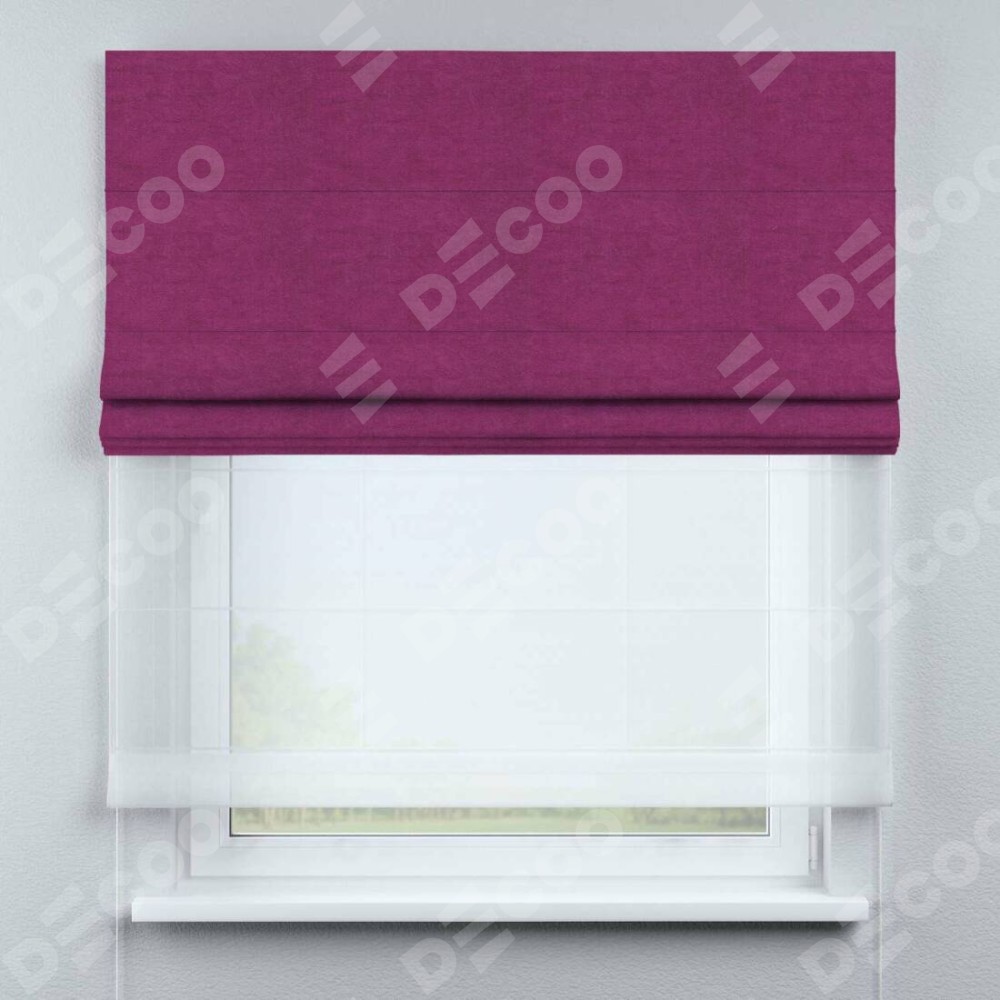Римская штора день-ночь производителя «Cortin», используется для проёма, пошита из двух полотен, с лицевой стороны вельвет фиолетовый артикул 85552, вторая ткань тюль (по стандарту комплектуется тюль белого цвета артикул V-01). Имеет универсальный механизм и подходит для монтажа: на потолок, на стену и в нишу.