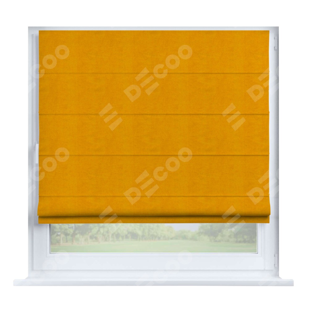 Римская штора производителя «Cortin», устанавливается на створку окна, пошита из ткани вельвет желтый, артикул 85547. Штора шьётся по индивидуальным размерам, для данного типа римской шторы возможная ширина от 35 до 150 см., высота до 250 см.