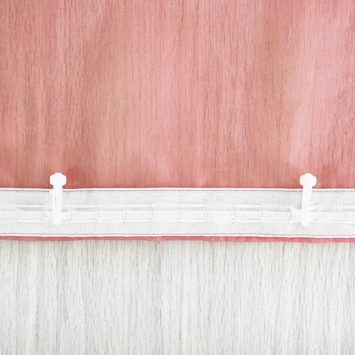 К шторе пришита лента шириной 2 см, изделие крепится к карнизу на крючки. Специальный шнурок позволяет задрапировать складки.
