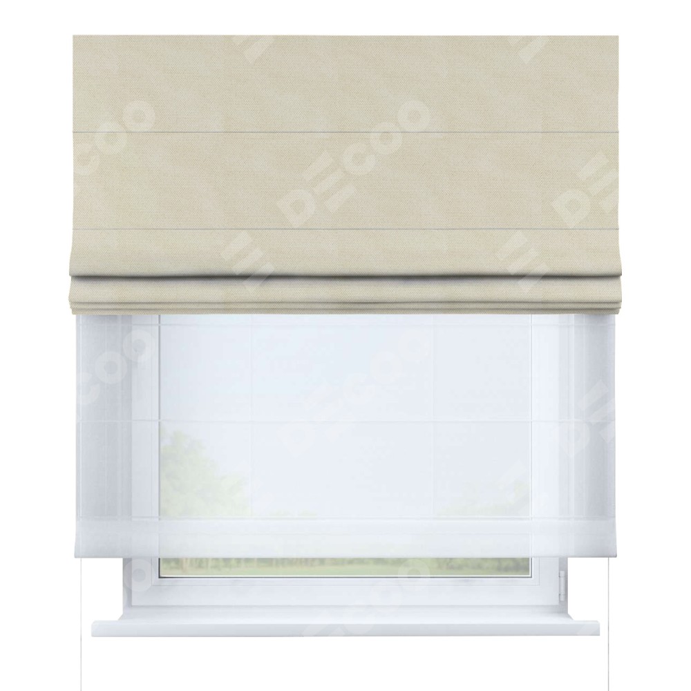 Римская штора день-ночь производителя «Cortin», используется для проёма, пошита из двух полотен, с лицевой стороны лён димаут бежевый артикул 83023, вторая ткань тюль (по стандарту комплектуется тюль белого цвета артикул V-01). Имеет универсальный механизм и подходит для монтажа: на потолок, на стену и в нишу.