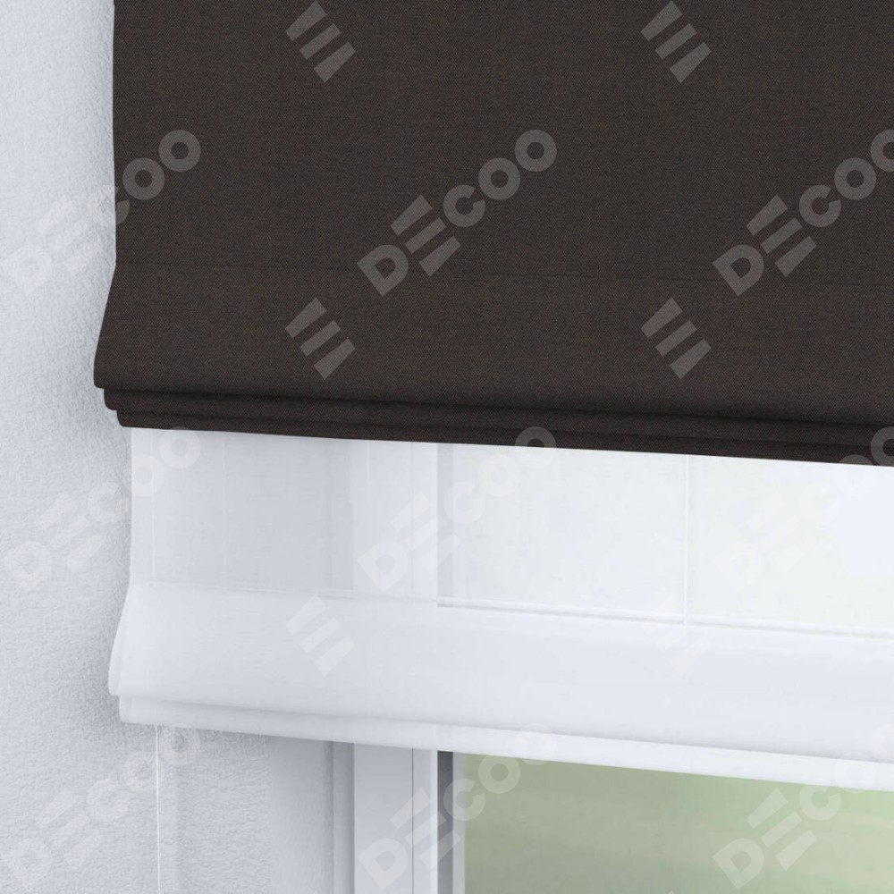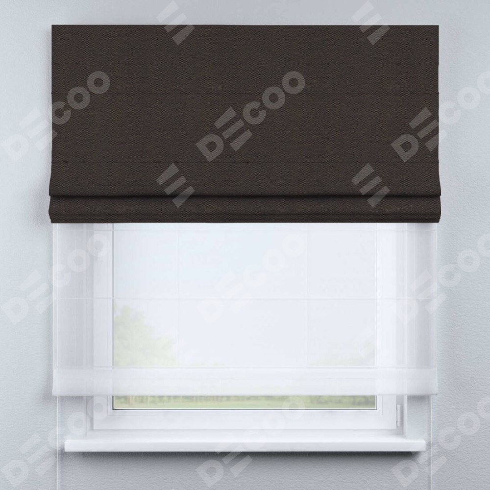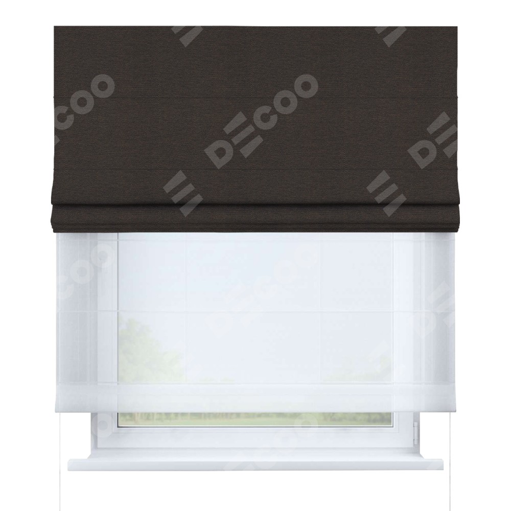 Римская штора день-ночь производителя «Cortin», используется для проёма, пошита из двух полотен, с лицевой стороны лён димаут венге артикул 85410, вторая ткань тюль (по стандарту комплектуется тюль белого цвета артикул V-01). Имеет универсальный механизм и подходит для монтажа: на потолок, на стену и в нишу.