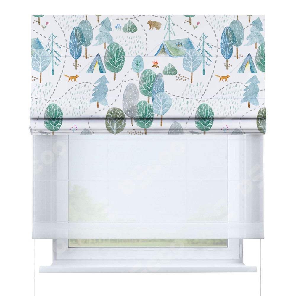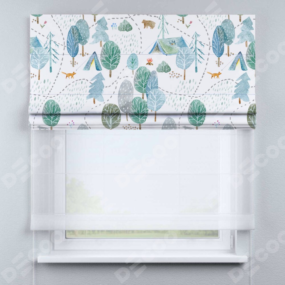 Римская штора день-ночь производителя «Cortin», используется для проёма, пошита из двух полотен, с лицевой блэкаут с нанесением сублимационной печати «Лесистая местность», вторая ткань тюль (по стандарту комплектуется тюль белого цвета артикул V-01). Имеет универсальный механизм и подходит для монтажа: на потолок, на стену и в нишу.