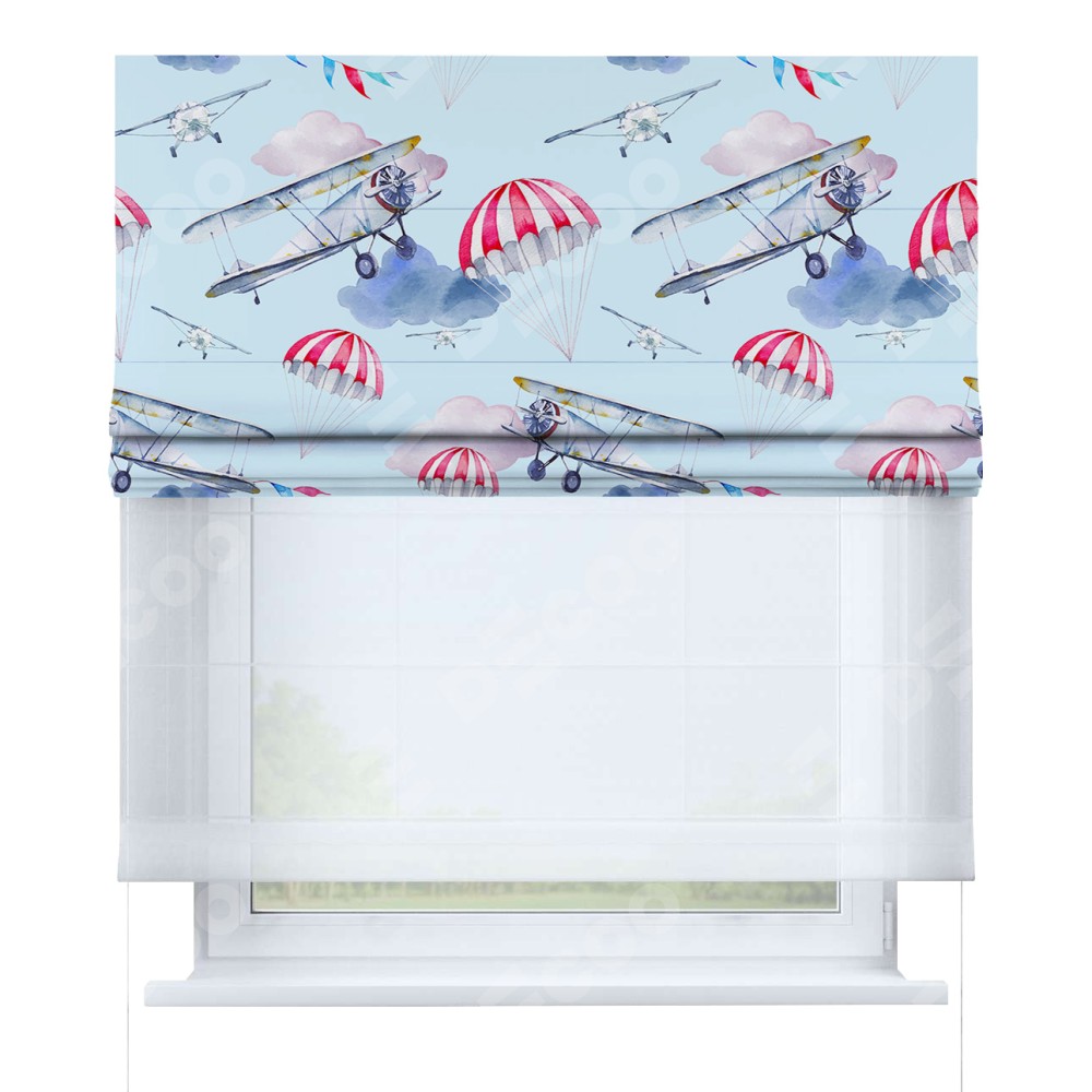 Римская штора день-ночь производителя «Cortin», используется для проёма, пошита из двух полотен, с лицевой блэкаут с нанесением сублимационной печати «Самолёт», вторая ткань тюль (по стандарту комплектуется тюль белого цвета артикул V-01). Имеет универсальный механизм и подходит для монтажа: на потолок, на стену и в нишу.