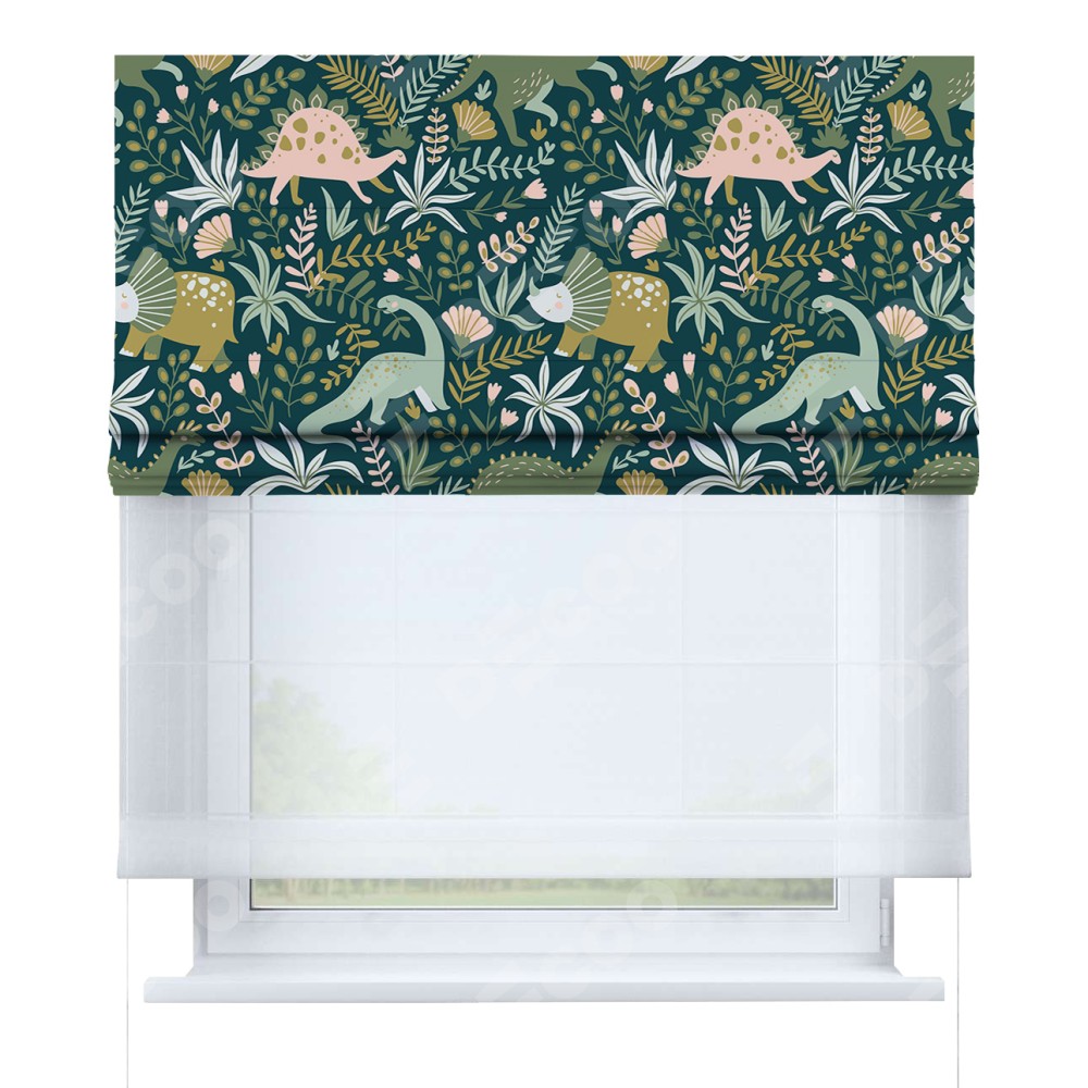 Римская штора день-ночь производителя «Cortin», используется для проёма, пошита из двух полотен, с лицевой блэкаут с нанесением сублимационной печати «Удивительный дино», вторая ткань тюль (по стандарту комплектуется тюль белого цвета артикул V-01). Имеет универсальный механизм и подходит для монтажа: на потолок, на стену и в нишу.