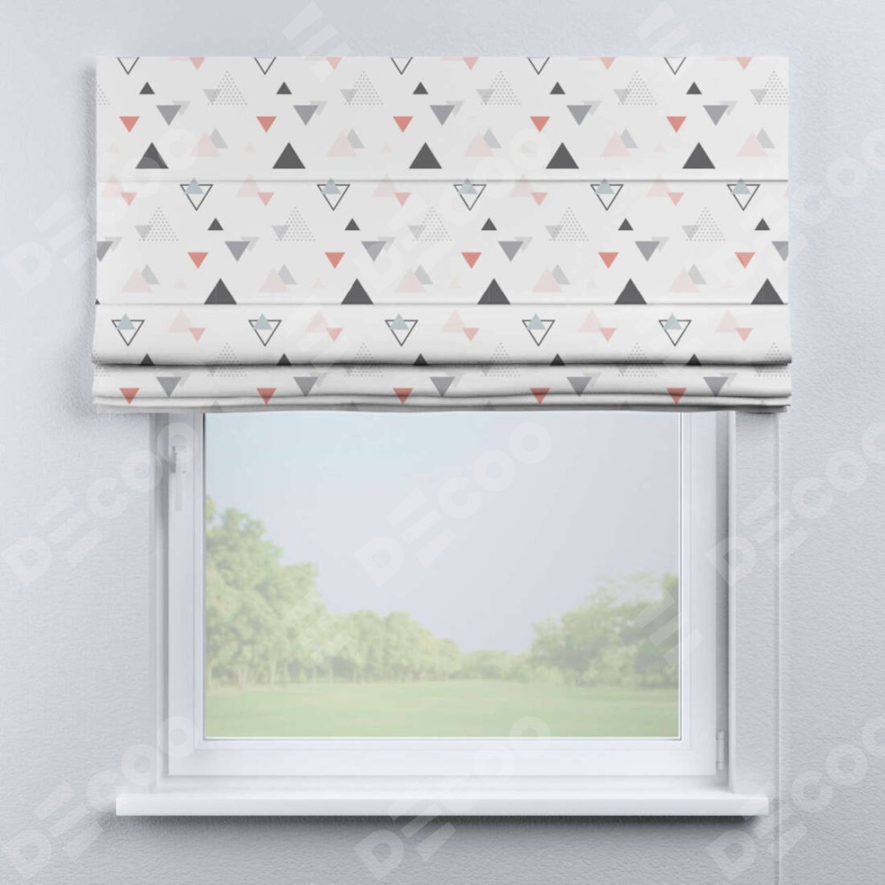 Римская штора производителя «Cortin», используется для проёма, пошита из ткани блэкаут с нанесением сублимационной печати «Дождь из треугольников». Имеет универсальный механизм и подходит для монтажа: на потолок, на стену и в нишу.