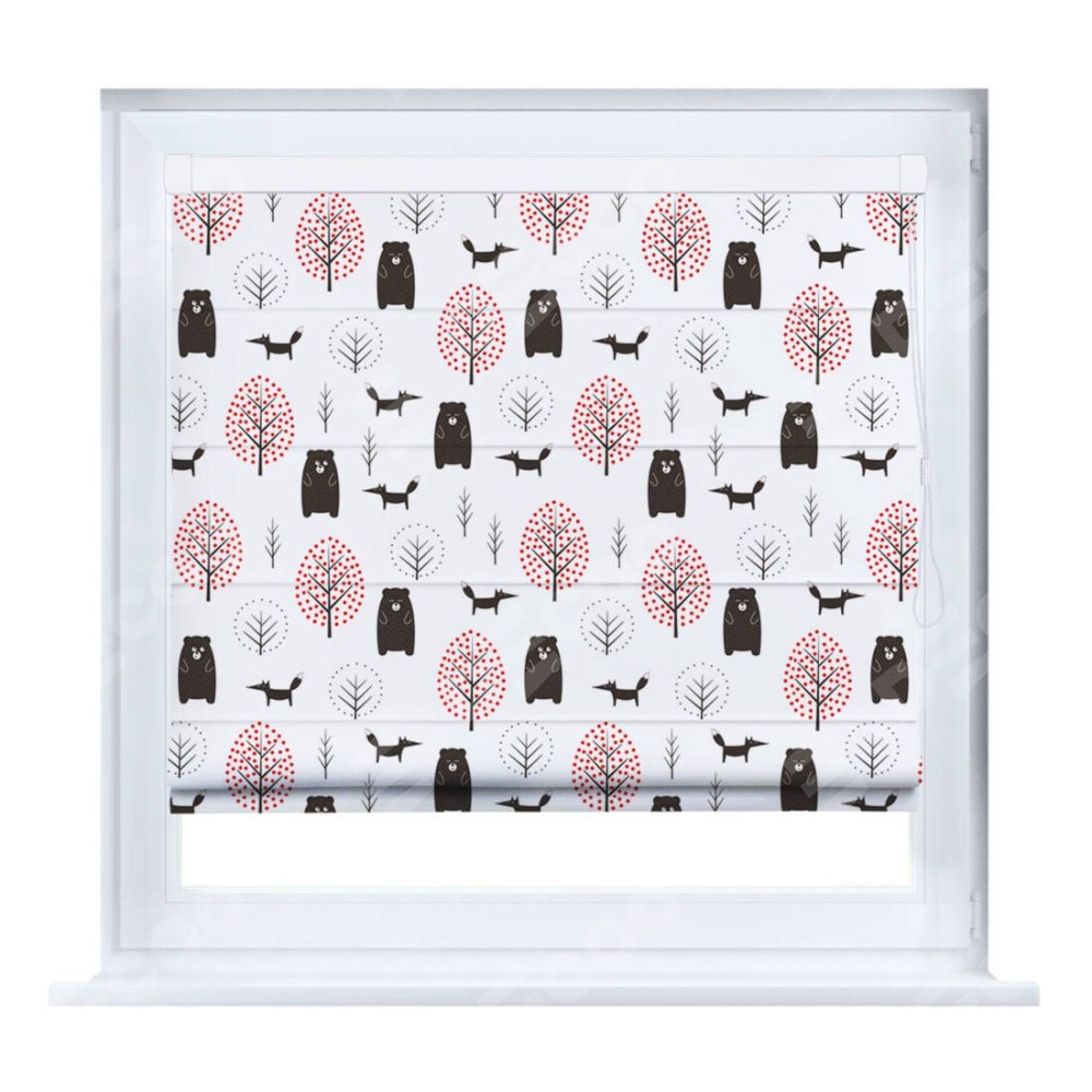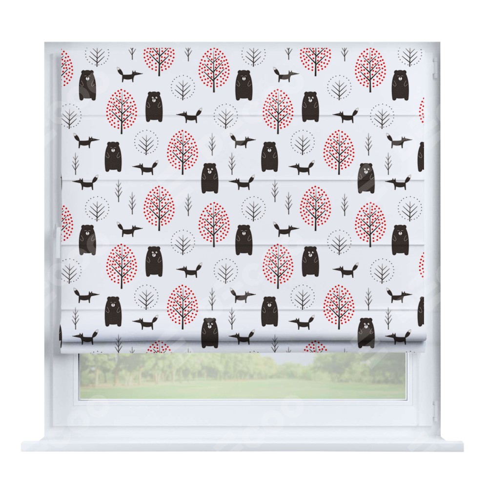 Римская штора производителя «Cortin», устанавливается на створку окна, пошита из ткани блэкаут с нанесением сублимационной печати «Сканди лес». Штора шьётся по индивидуальным размерам, для данного типа римской шторы возможная ширина от 35 до 150 см., высота до 250 см.