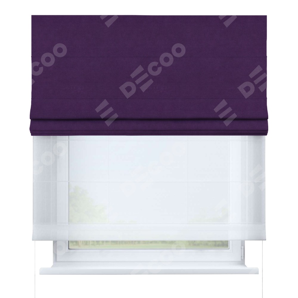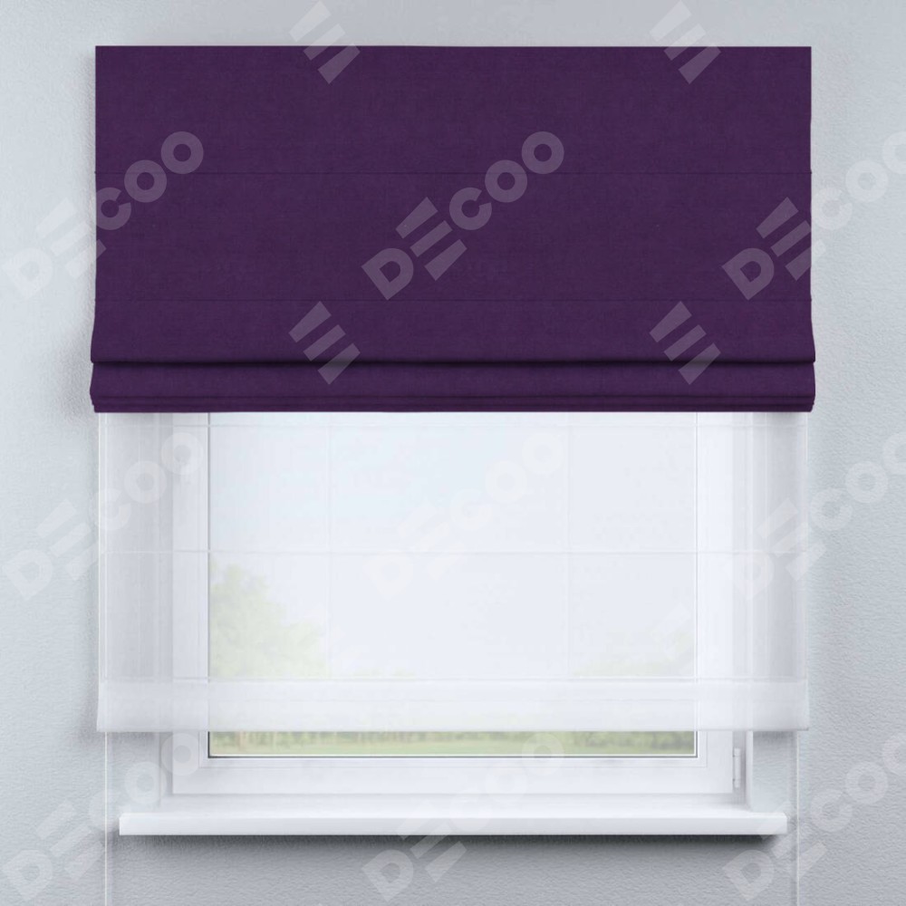 Римская штора день-ночь производителя «Cortin», используется для проёма, пошита из двух полотен, с лицевой стороны вельвет тёмно-фиолетовый артикул 17753, вторая ткань тюль (по стандарту комплектуется тюль белого цвета артикул V-01). Имеет универсальный механизм и подходит для монтажа: на потолок, на стену и в нишу.
