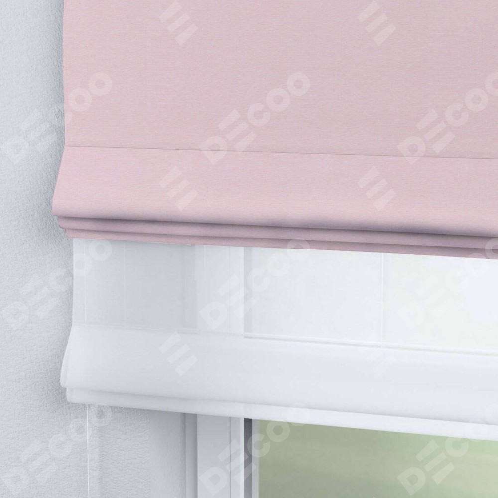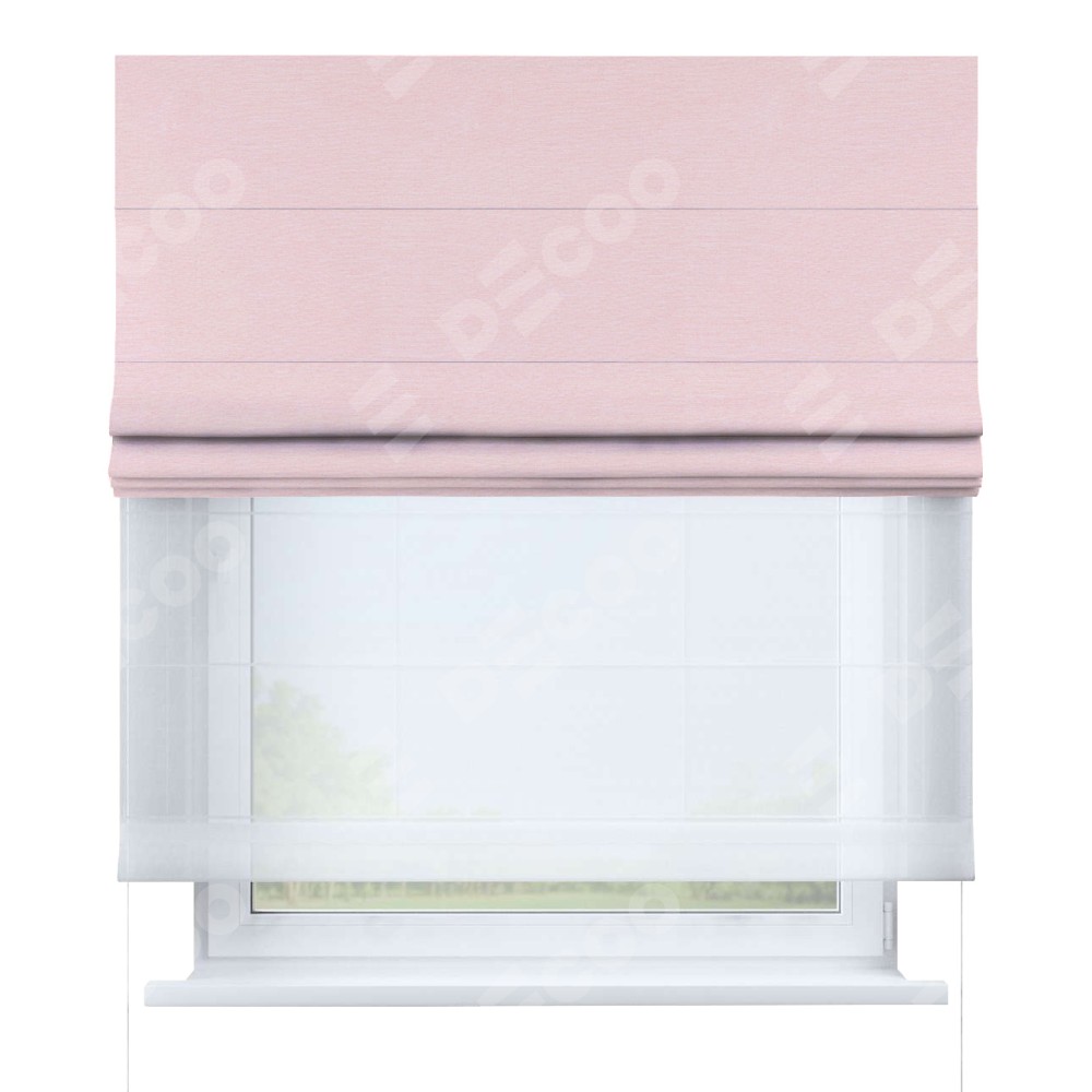 Римская штора день-ночь производителя «Cortin», используется для проёма, пошита из двух полотен, с лицевой стороны блэкаут однотонный розовый артикул 83046, вторая ткань тюль (по стандарту комплектуется тюль белого цвета артикул V-01). Имеет универсальный механизм и подходит для монтажа: на потолок, на стену и в нишу.
