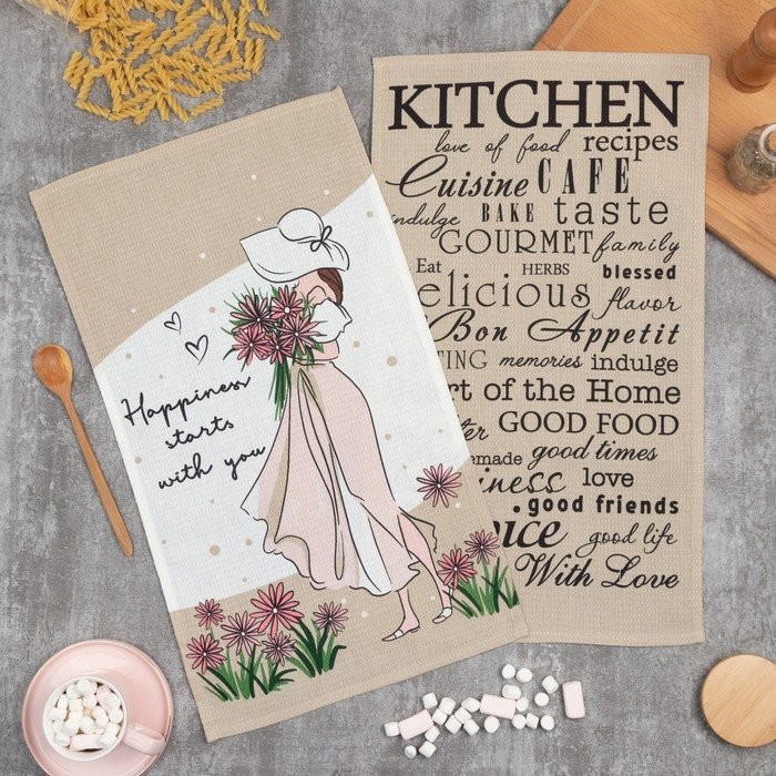 Набор кухонных полотенец Доляна Happiness, 35×60 см -2 шт, 100% хл, вафля 160 г/м2