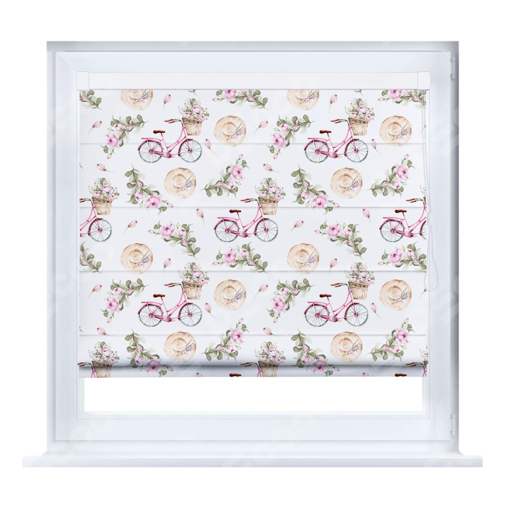Римская штора кассетного типа, производителя «Cortin», устанавливается только на пластиковые окна и прилегает к стеклопакету, пошита из ткани блэкаут с нанесением сублимационной печати «Розовый велосипед».