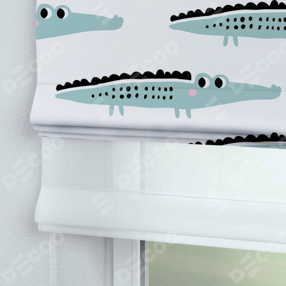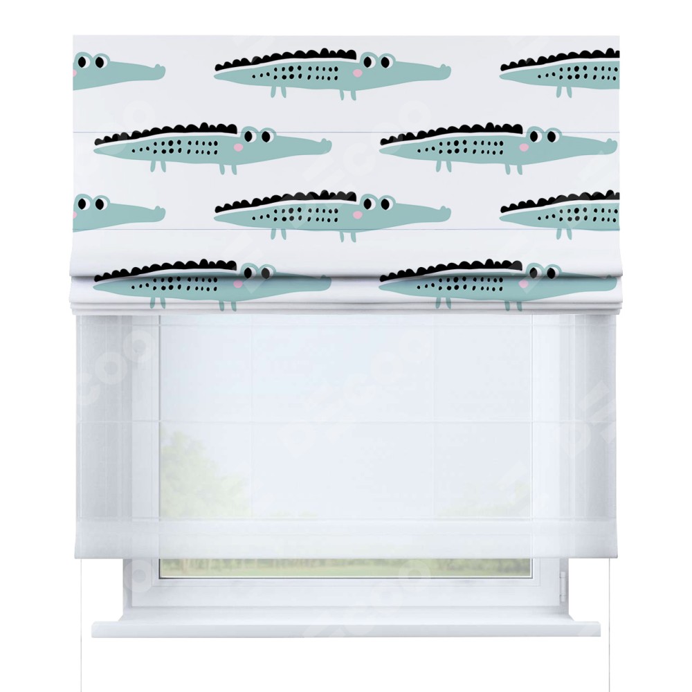Римская штора день-ночь производителя «Cortin», используется для проёма, пошита из двух полотен, с лицевой блэкаут с нанесением сублимационной печати «Мистер Крок», вторая ткань тюль (по стандарту комплектуется тюль белого цвета артикул V-01). Имеет универсальный механизм и подходит для монтажа: на потолок, на стену и в нишу.