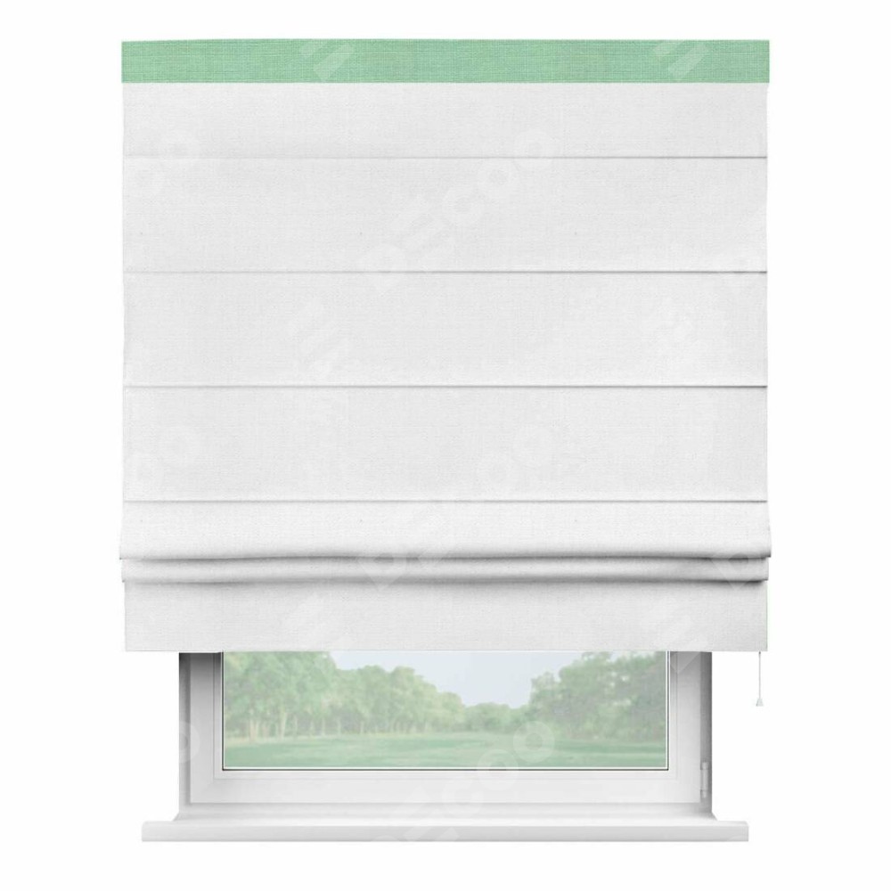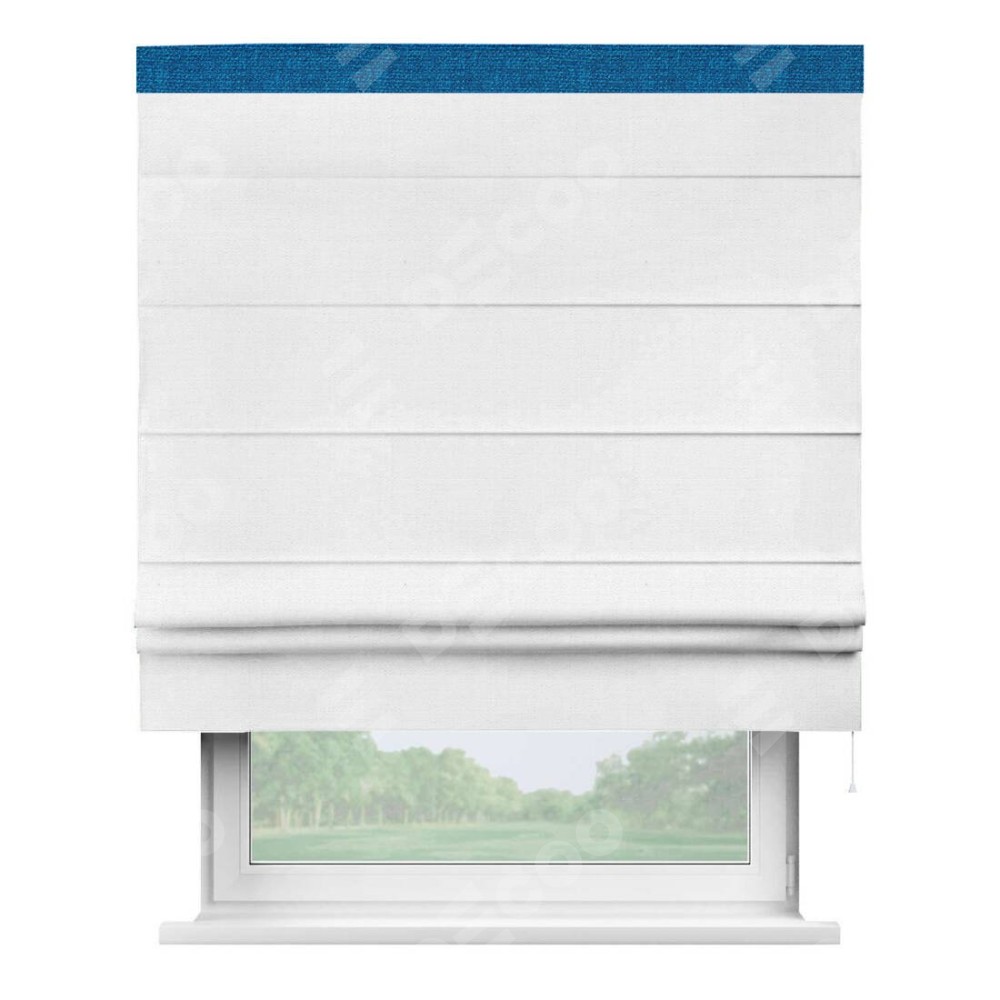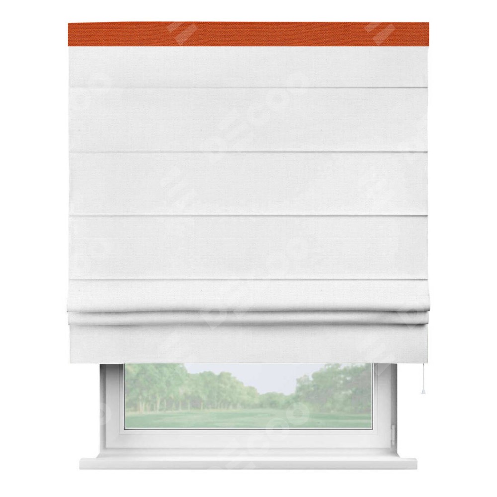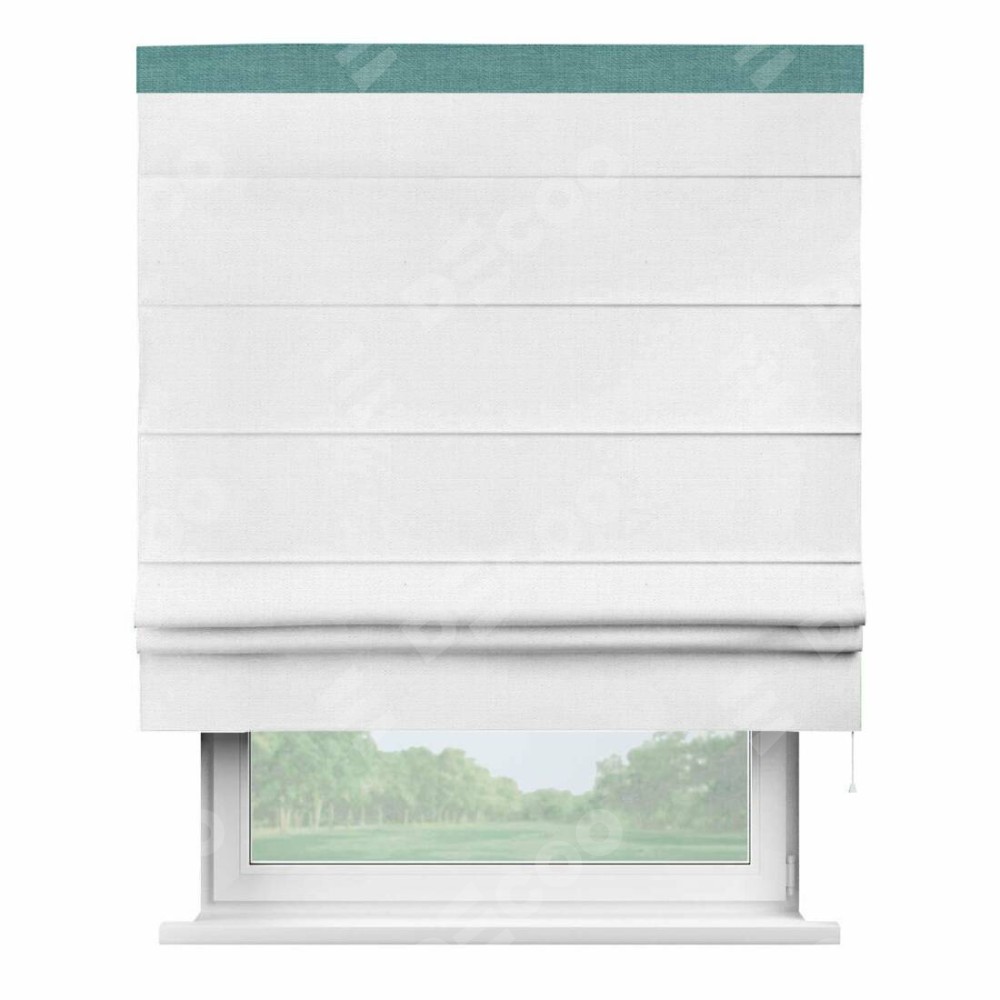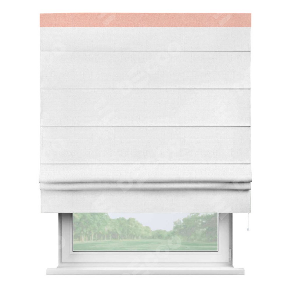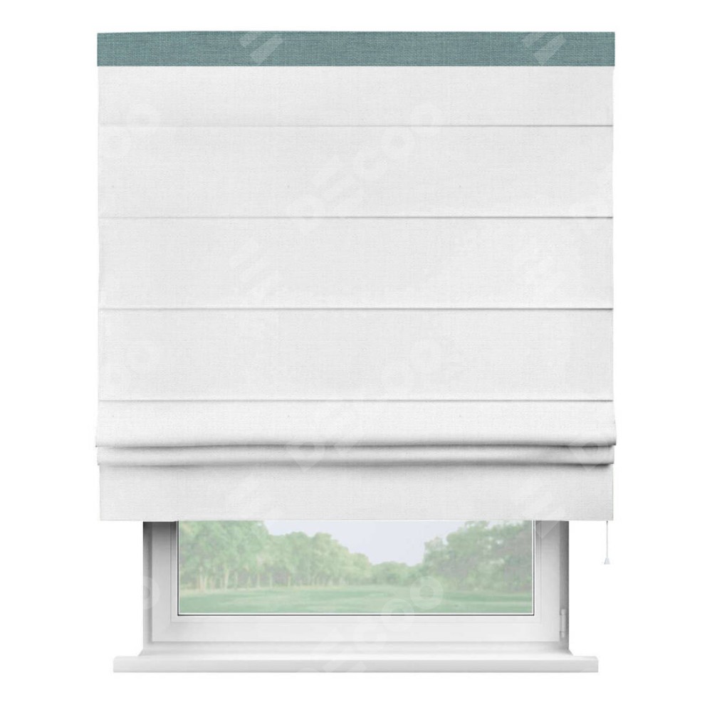 Римская штора производителя «Cortin», используется для проёма, пошита из ткани лён белый, артикул 53430. Отделка шторы кантом «Кинг», ткань для канта используется из льна разной расцветки на выбор. Имеет универсальный механизм и подходит для монтажа: на потолок, на стену и в нишу.