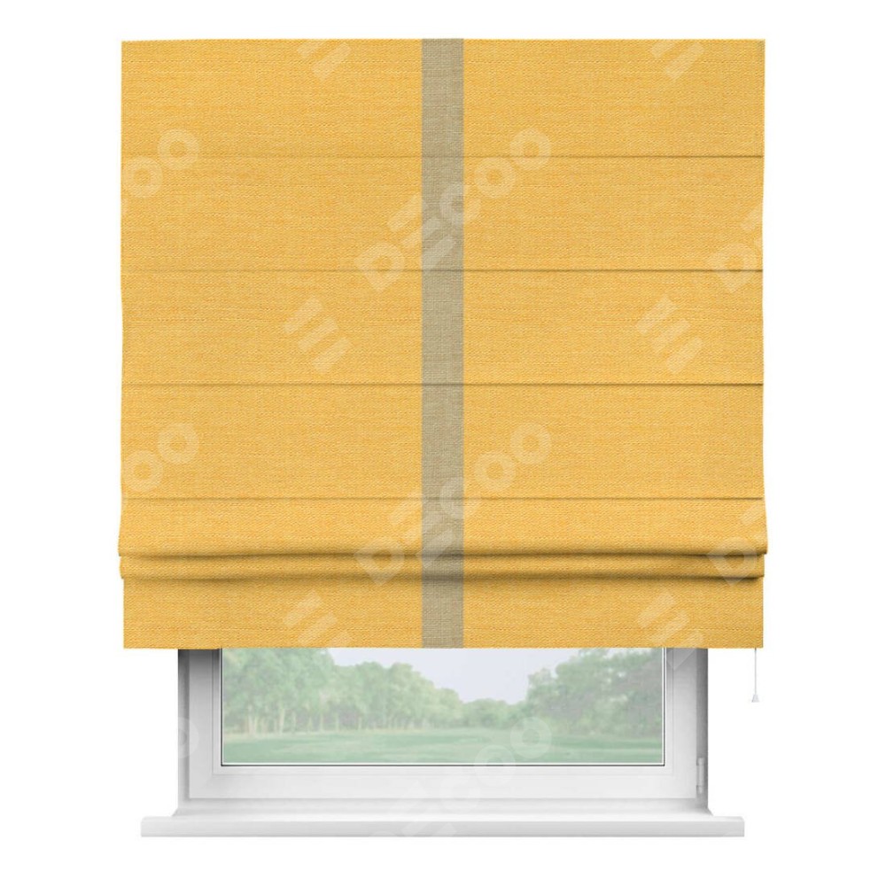 Римская штора производителя «Cortin», используется для проёма, пошита из ткани лён желтый, артикул 63738. Отделка шторы кантом «Хайвэй», ткань для канта используется из льна разной расцветки на выбор. Имеет универсальный механизм и подходит для монтажа: на потолок, на стену и в нишу.
