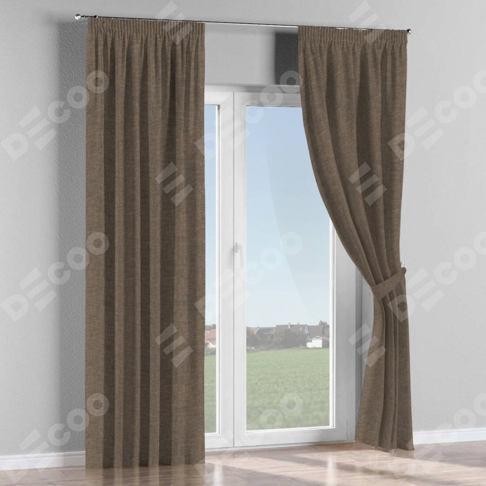 Комплект прямых штор, от производителя «Cortin», пошиты из ткани рогожка димаут коричневый, артикул ткани 80420. С изнаночной стороны в верхней части штор пристрачивается шторная лента с декоративными складками «Карандаш». Для создания элегантных складок прямые шторы шьются по стандарту с коэффициентом 1:2 (на 100 см. ширины проёма 200 см. ширины ткани).