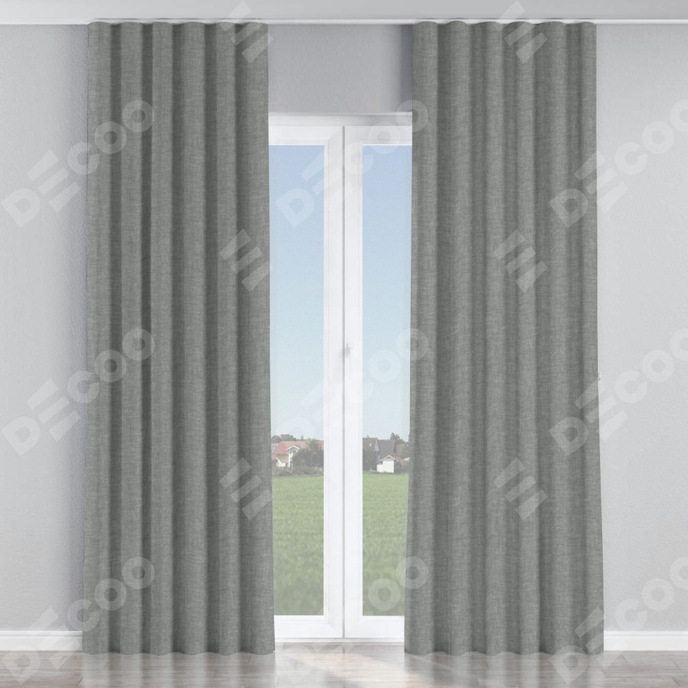 Комплект прямых штор, от производителя «Cortin», пошиты из ткани рогожка димаут тёмно-серый, артикул ткани 80418. С изнаночной стороны в верхней части штор пристрачивается шторная лента с декоративными складками «Волна». Для создания элегантных складок прямые шторы шьются по стандарту с коэффициентом 1:2 (на 100 см. ширины проёма 200 см. ширины ткани).