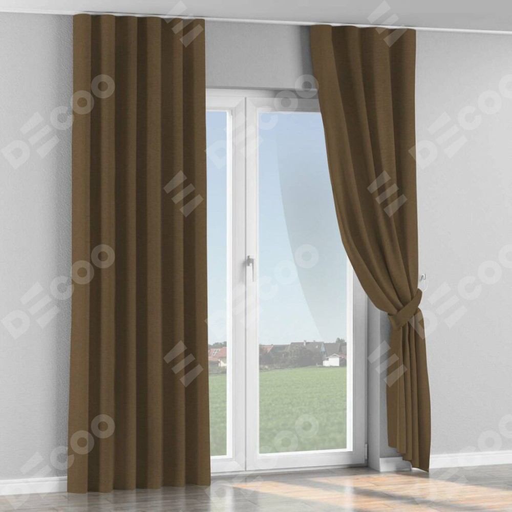 Комплект прямых штор, от производителя «Cortin», пошиты из ткани лён димаут тёмно-коричневый, артикул ткани 83030. С изнаночной стороны в верхней части штор пристрачивается шторная лента с декоративными складками «Волна». Для создания элегантных складок прямые шторы шьются по стандарту с коэффициентом 1:2 (на 100 см. ширины проёма 200 см. ширины ткани).