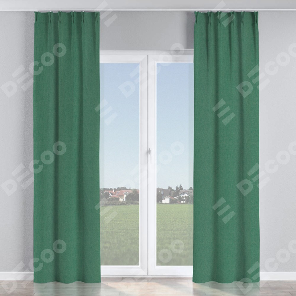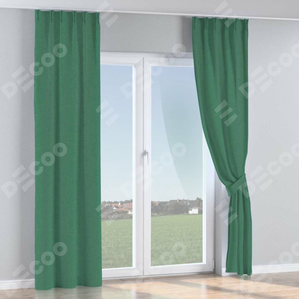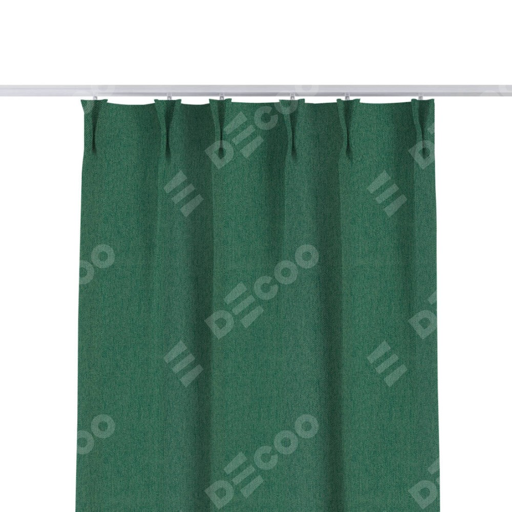 Комплект прямых штор, от производителя «Cortin», пошиты из ткани твид блэкаут зелёный, артикул ткани 21589. С изнаночной стороны в верхней части штор пристрачивается шторная лента с декоративными складками «Кустик». Для создания элегантных складок прямые шторы шьются по стандарту с коэффициентом 1:2 (на 100 см. ширины проёма 200 см. ширины ткани).