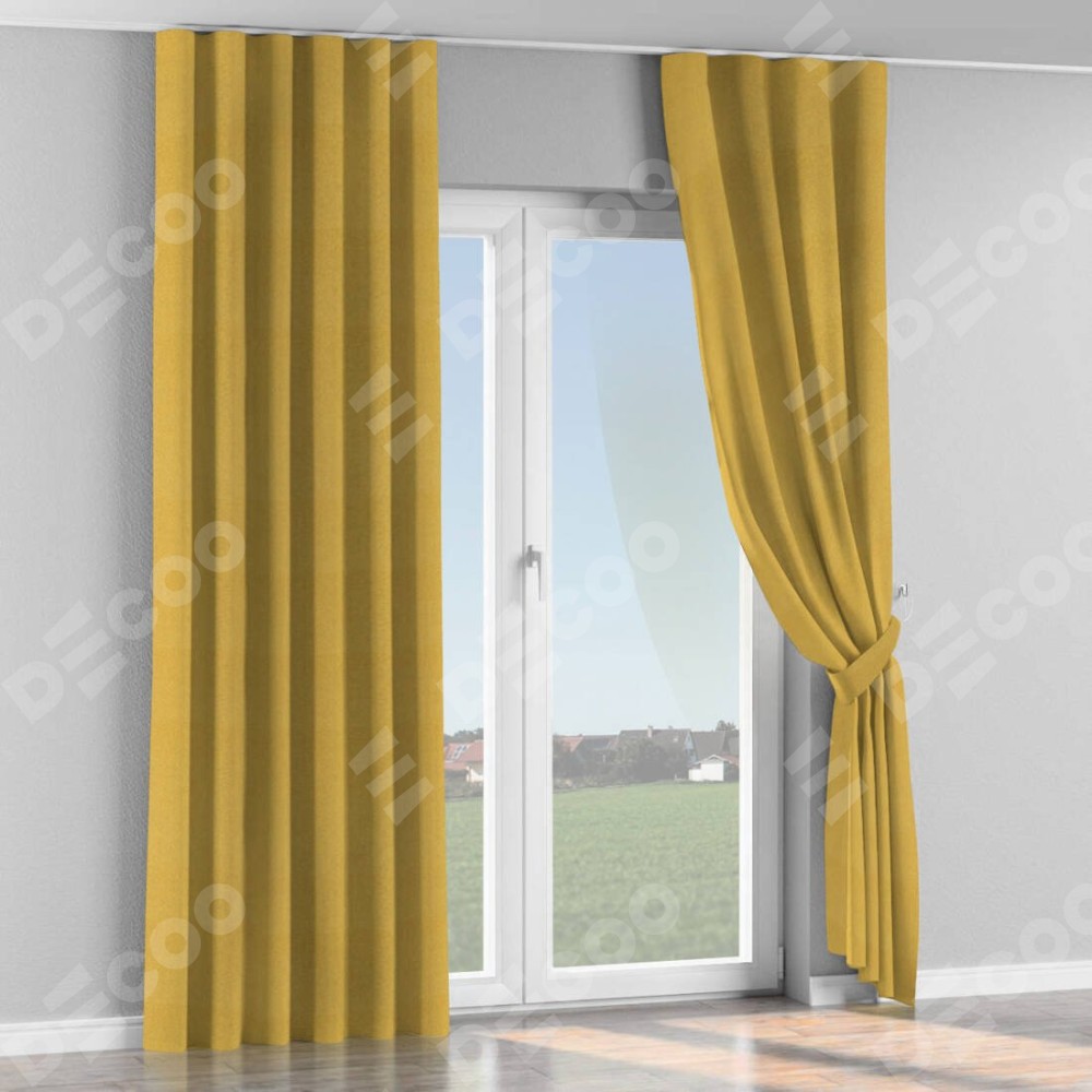 Комплект прямых штор, от производителя «Cortin», пошиты из ткани твид блэкаут пыльная горчица, артикул ткани 21588. С изнаночной стороны в верхней части штор пристрачивается шторная лента с декоративными складками «Волна». Для создания элегантных складок прямые шторы шьются по стандарту с коэффициентом 1:2 (на 100 см. ширины проёма 200 см. ширины ткани).