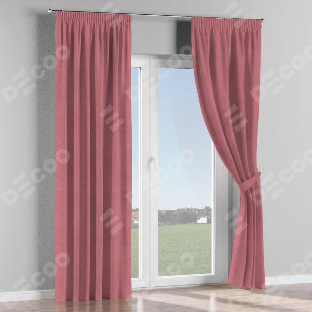 Комплект прямых штор, от производителя «Cortin», пошиты из ткани вельвет брусника, артикул ткани 85550. С изнаночной стороны в верхней части штор пристрачивается шторная лента с декоративными складками «Карандаш». Для создания элегантных складок прямые шторы шьются по стандарту с коэффициентом 1:2 (на 100 см. ширины проёма 200 см. ширины ткани).
