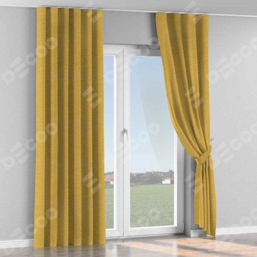 Комплект прямых штор, от производителя «Cortin», пошиты из ткани лён горчичный, артикул ткани 74740. С изнаночной стороны в верхней части штор пристрачивается шторная лента с декоративными складками «Волна». Для создания элегантных складок прямые шторы шьются по стандарту с коэффициентом 1:2 (на 100 см. ширины проёма 200 см. ширины ткани).