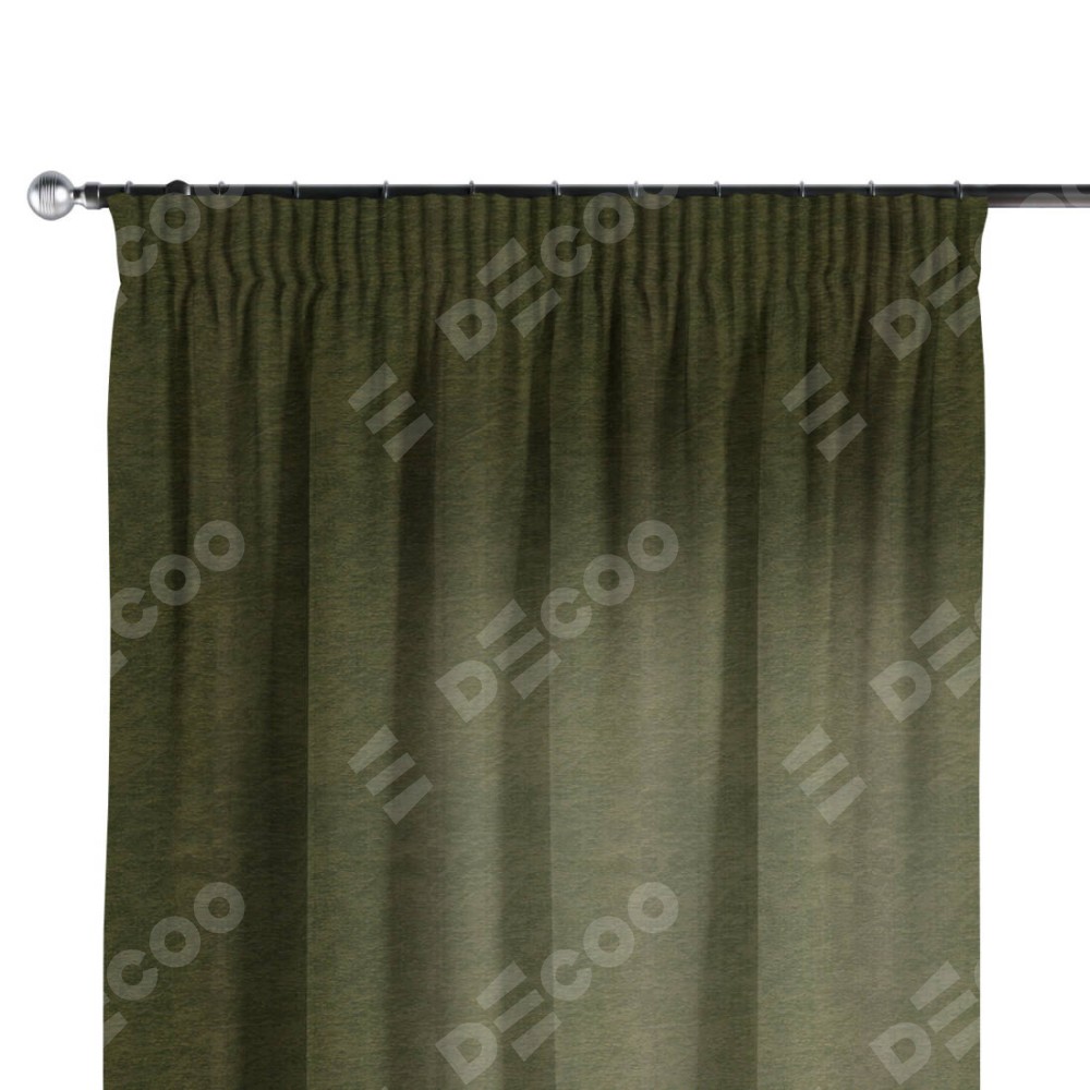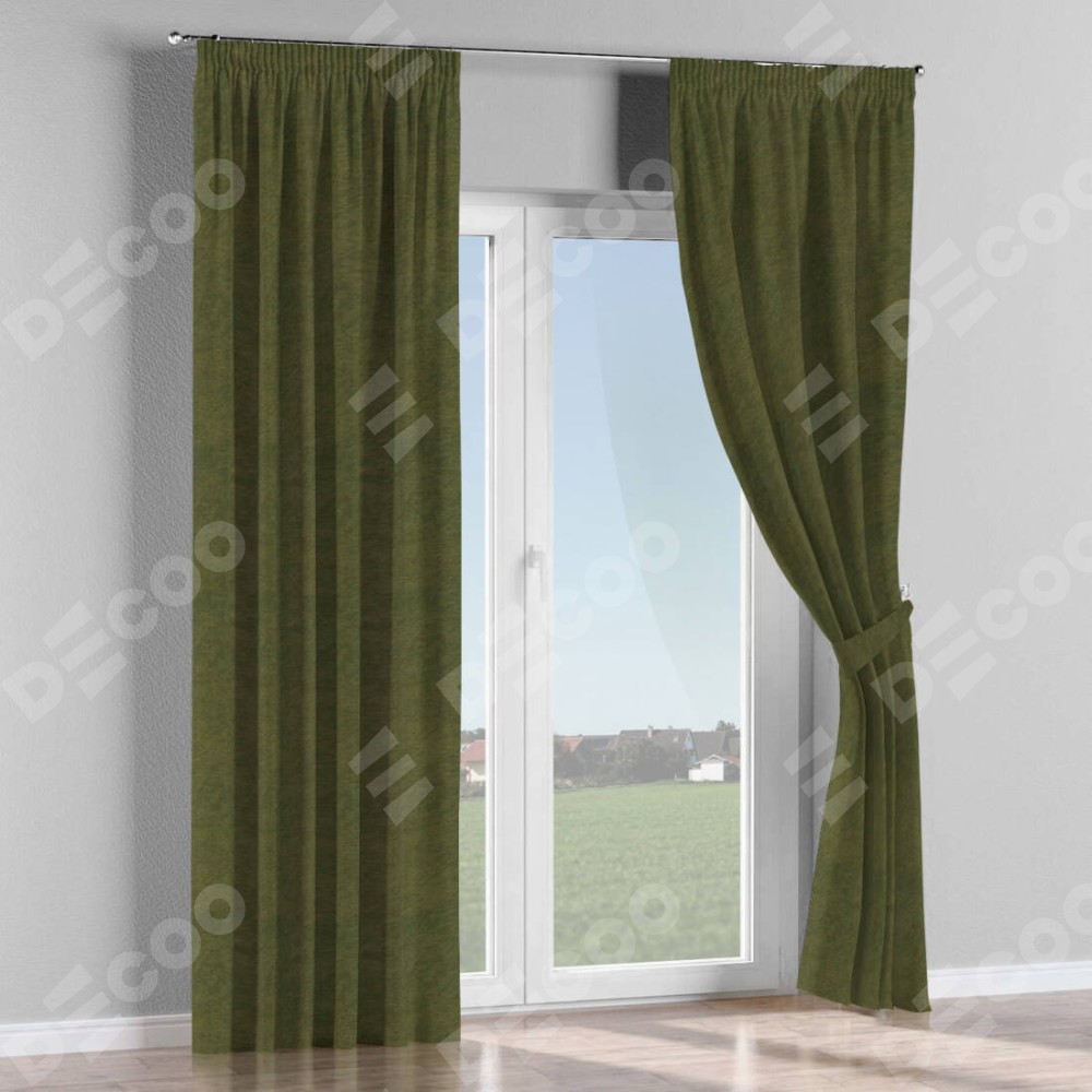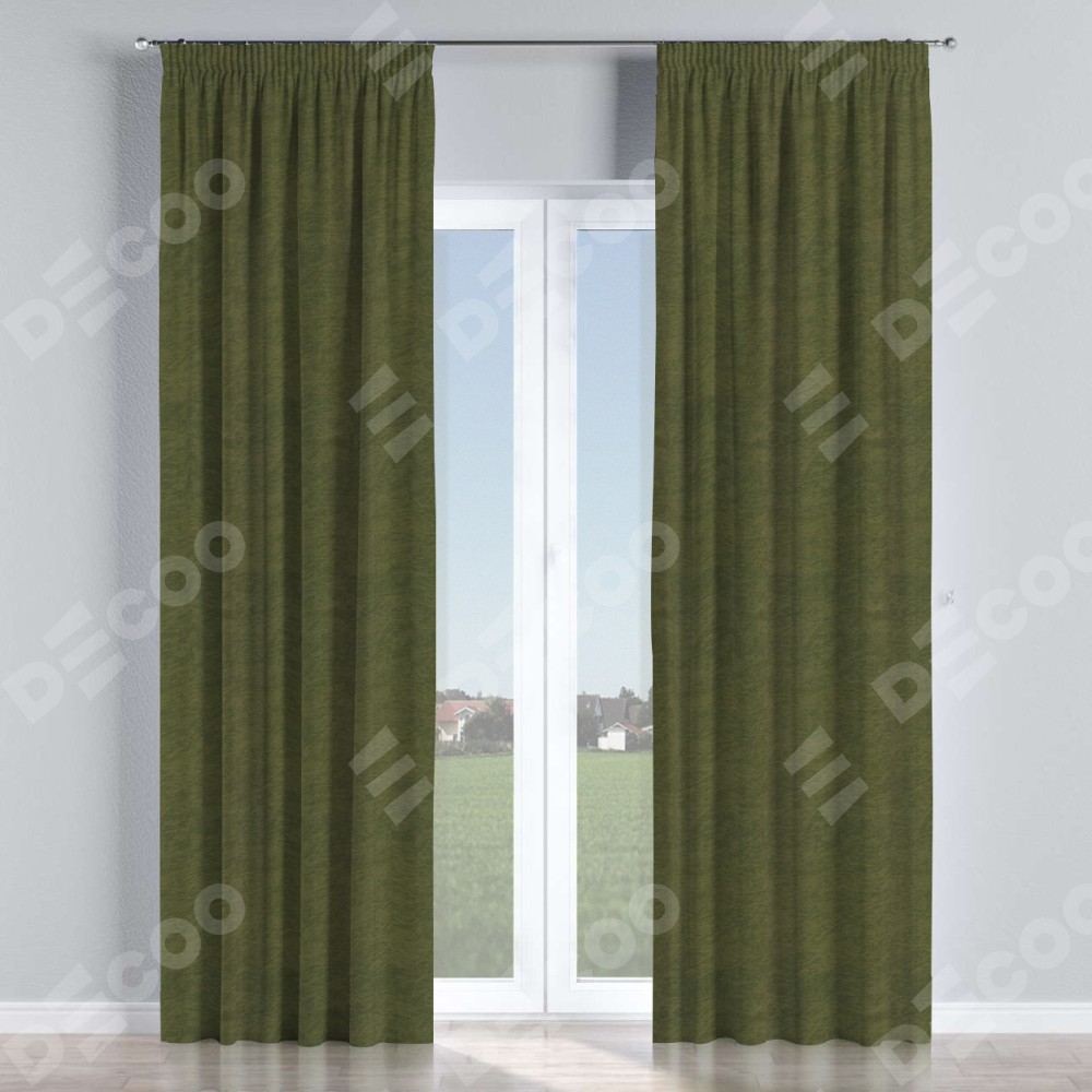 Комплект прямых штор, от производителя «Cortin», пошиты из ткани софт однотонный зелёный, артикул ткани 33110. С изнаночной стороны в верхней части штор пристрачивается шторная лента с декоративными складками «Карандаш». Для создания элегантных складок прямые шторы шьются по стандарту с коэффициентом 1:2 (на 100 см. ширины проёма 200 см. ширины ткани).
