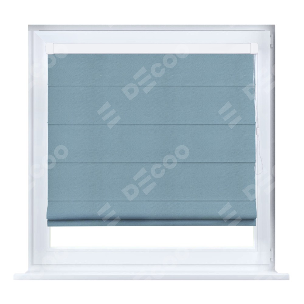 Римская штора кассетного типа, производителя «Cortin», устанавливается только на пластиковые окна и прилегает к стеклопакету, пошита из ткани блэкаут однотонный серо-голубой, артикул 29327.