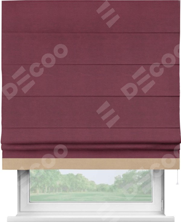 Римская штора производителя «Cortin», используется для проёма, пошита из ткани вельвет бордовый, артикул ткани 85553. Отделка шторы кантом «Джестер», ткань для канта используется из вельвета разной расцветки на выбор. Имеет универсальный механизм и подходит для монтажа: на потолок, на стену и в нишу.