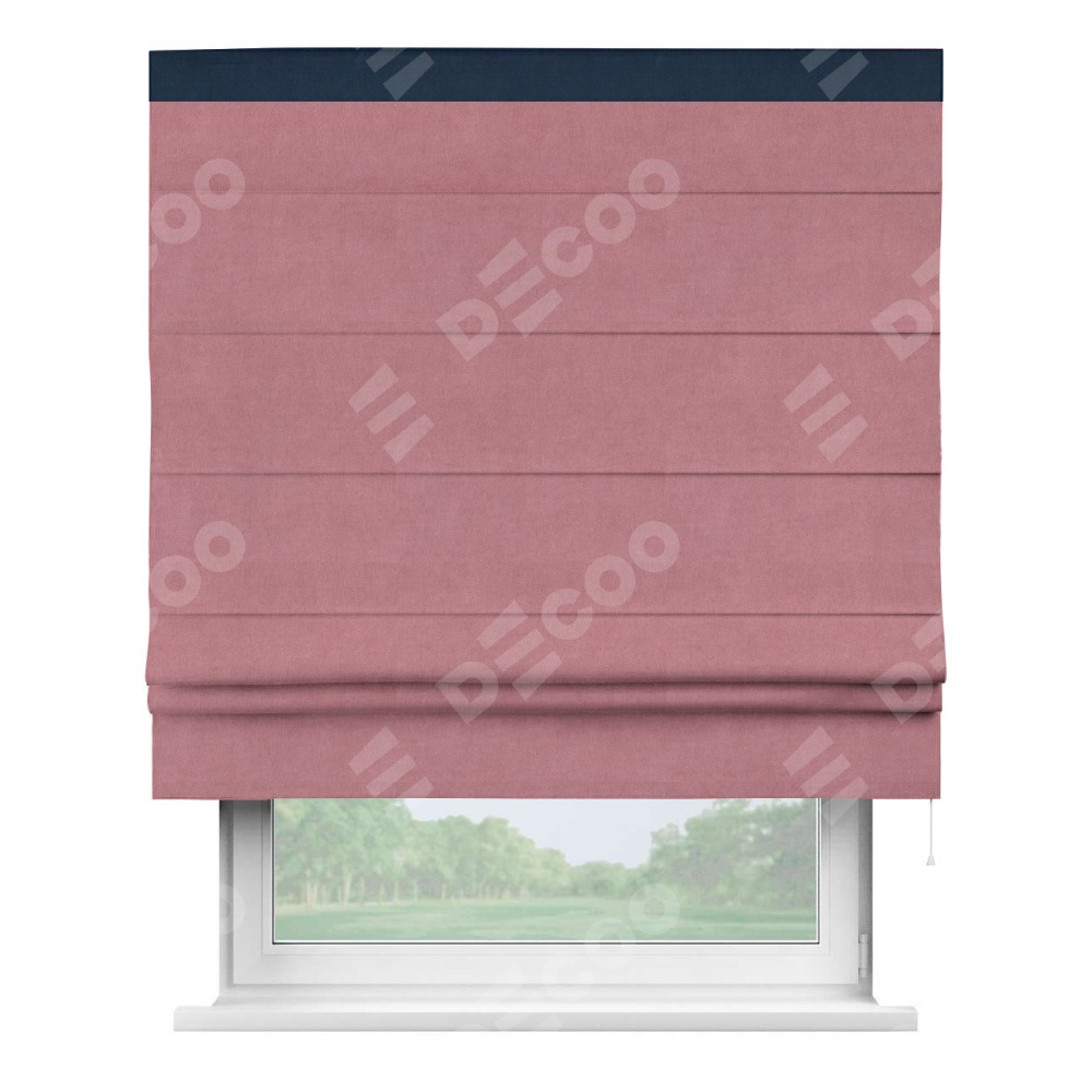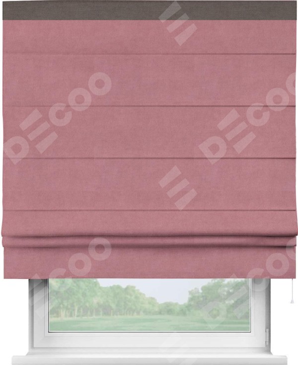 Римская штора производителя «Cortin», используется для проёма, пошита из ткани вельвет брусника, артикул ткани 85550. Отделка шторы кантом «Кинг», ткань для канта используется из вельвета разной расцветки на выбор. Имеет универсальный механизм и подходит для монтажа: на потолок, на стену и в нишу.