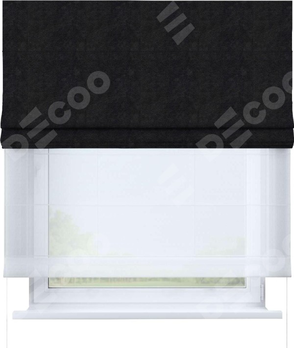 Римская штора день-ночь производителя «Cortin», используется для проёма, пошита из двух полотен, с лицевой стороны cotton блэкаут тёмно-серый артикул 35282, вторая ткань тюль (по стандарту комплектуется тюль белого цвета артикул V-01). Имеет универсальный механизм и подходит для монтажа: на потолок, на стену и в нишу.