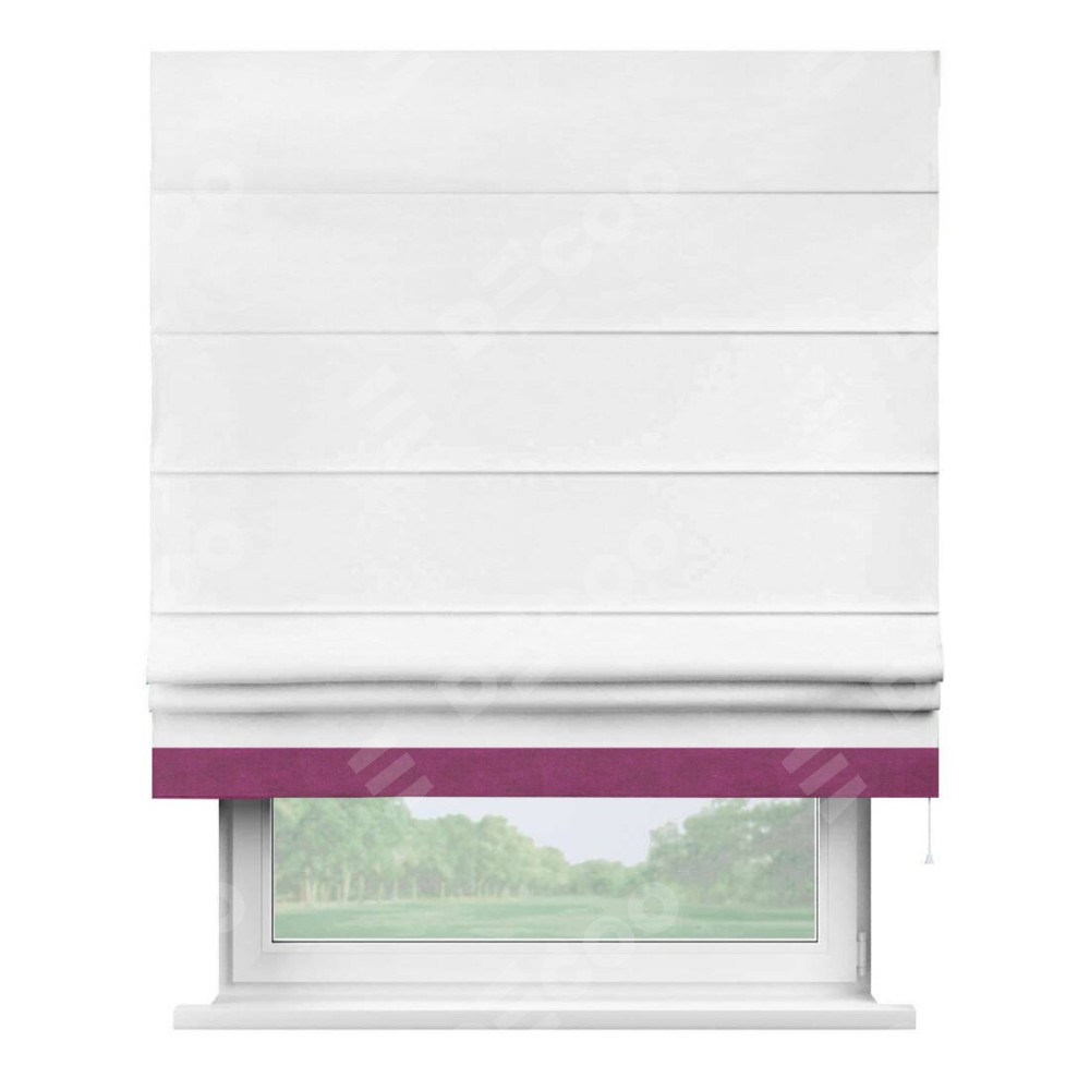 Римская штора производителя «Cortin», используется для проёма, пошита из ткани вельвет дымчато-белый, артикул ткани 85535. Отделка шторы кантом «Джестер», ткань для канта используется из вельвета разной расцветки на выбор. Имеет универсальный механизм и подходит для монтажа: на потолок, на стену и в нишу.