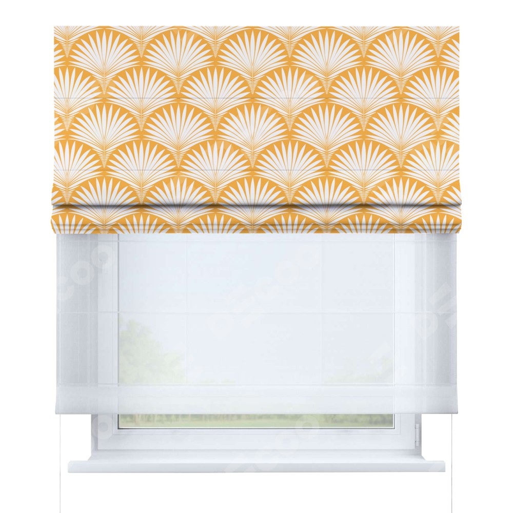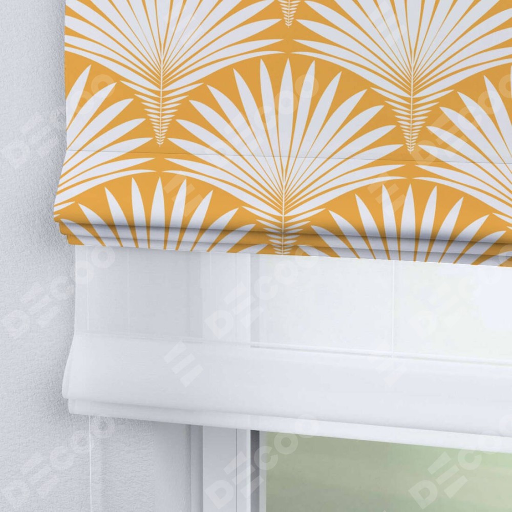 Римская штора день-ночь производителя «Cortin», используется для проёма, пошита из двух полотен, с лицевой блэкаут с нанесением сублимационной печати «Арт-деко листья желтый», вторая ткань тюль (по стандарту комплектуется тюль белого цвета артикул V-01). Имеет универсальный механизм и подходит для монтажа: на потолок, на стену и в нишу.