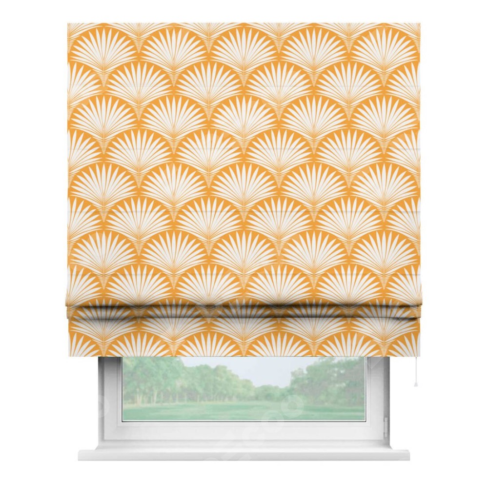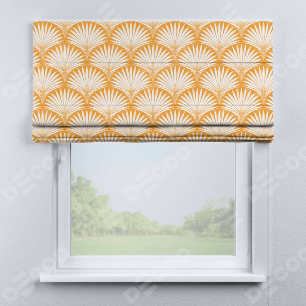 Римская штора производителя «Cortin», используется для проёма, пошита из ткани блэкаут с нанесением сублимационной печати «Арт-деко листья желтый». Имеет универсальный механизм и подходит для монтажа: на потолок, на стену и в нишу.