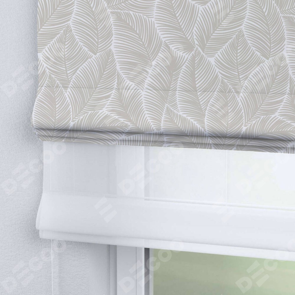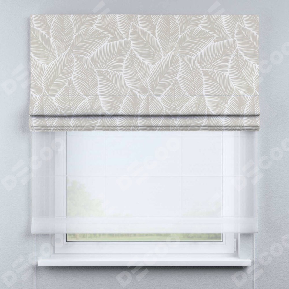 Римская штора день-ночь производителя «Cortin», используется для проёма, пошита из двух полотен, с лицевой блэкаут с нанесением сублимационной печати «Бежевые листья», вторая ткань тюль (по стандарту комплектуется тюль белого цвета артикул V-01). Имеет универсальный механизм и подходит для монтажа: на потолок, на стену и в нишу.