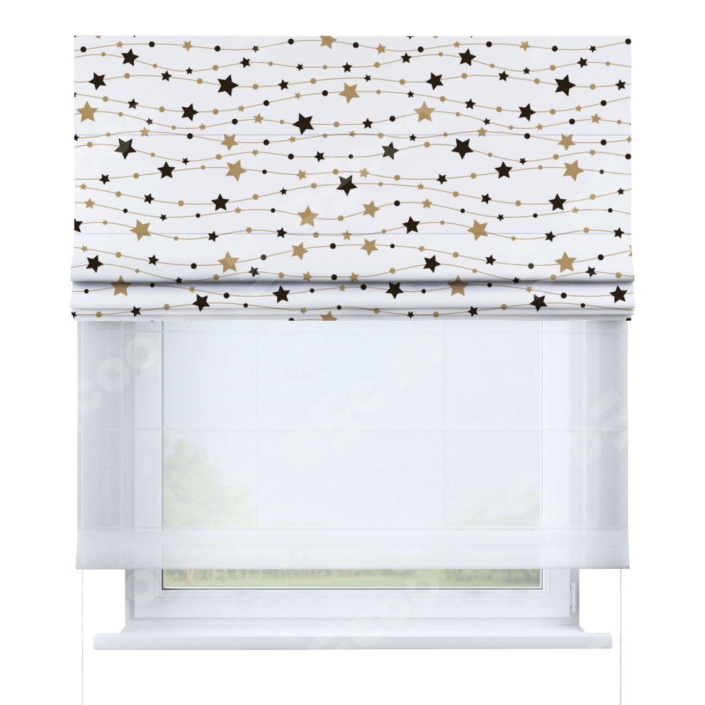 Римская штора день-ночь производителя «Cortin», используется для проёма, пошита из двух полотен, с лицевой блэкаут с нанесением сублимационной печати «Звёздная нить», вторая ткань тюль (по стандарту комплектуется тюль белого цвета артикул V-01). Имеет универсальный механизм и подходит для монтажа: на потолок, на стену и в нишу.