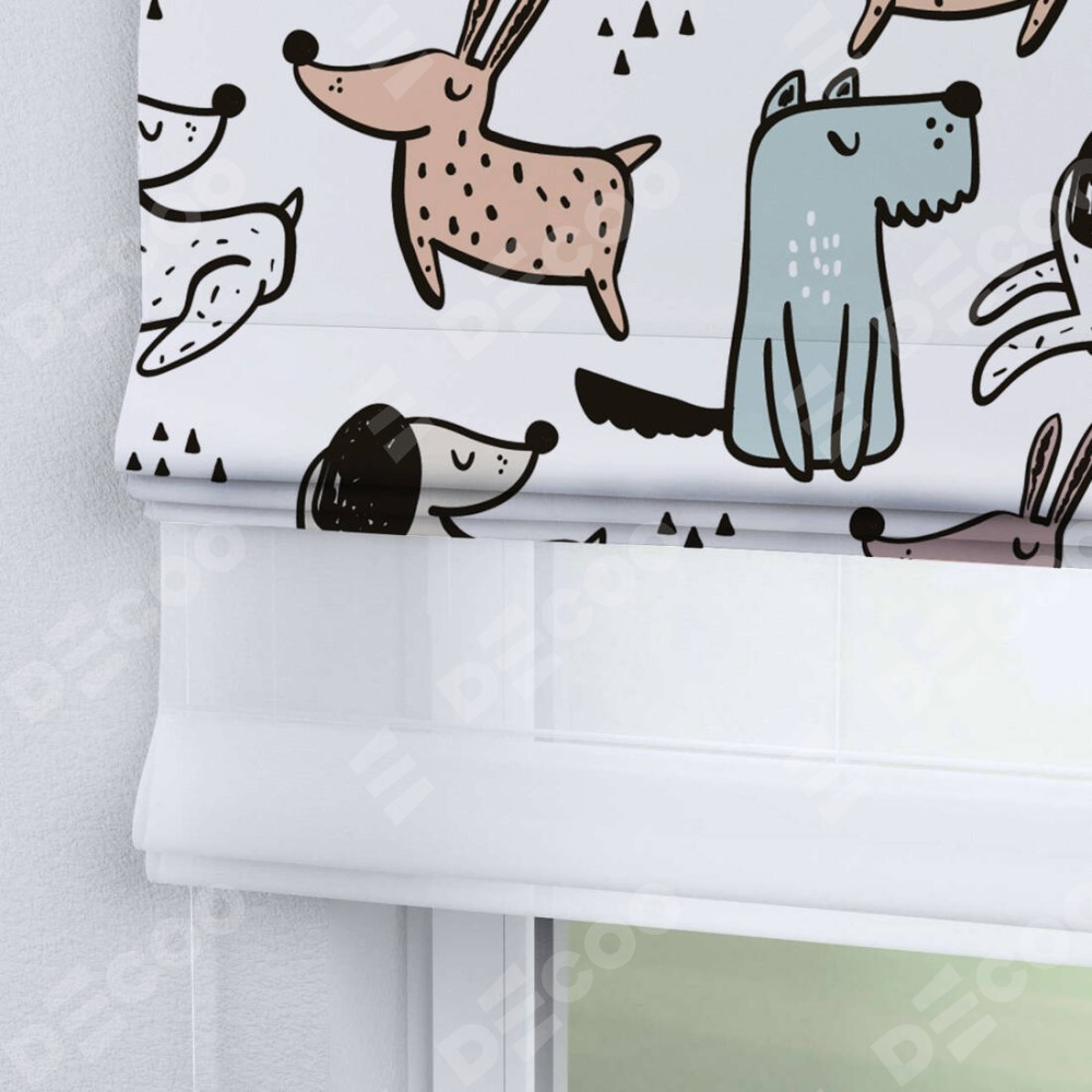 Римская штора день-ночь производителя «Cortin», используется для проёма, пошита из двух полотен, с лицевой блэкаут с нанесением сублимационной печати «Очаровательные щеночки», вторая ткань тюль (по стандарту комплектуется тюль белого цвета артикул V-01). Имеет универсальный механизм и подходит для монтажа: на потолок, на стену и в нишу.