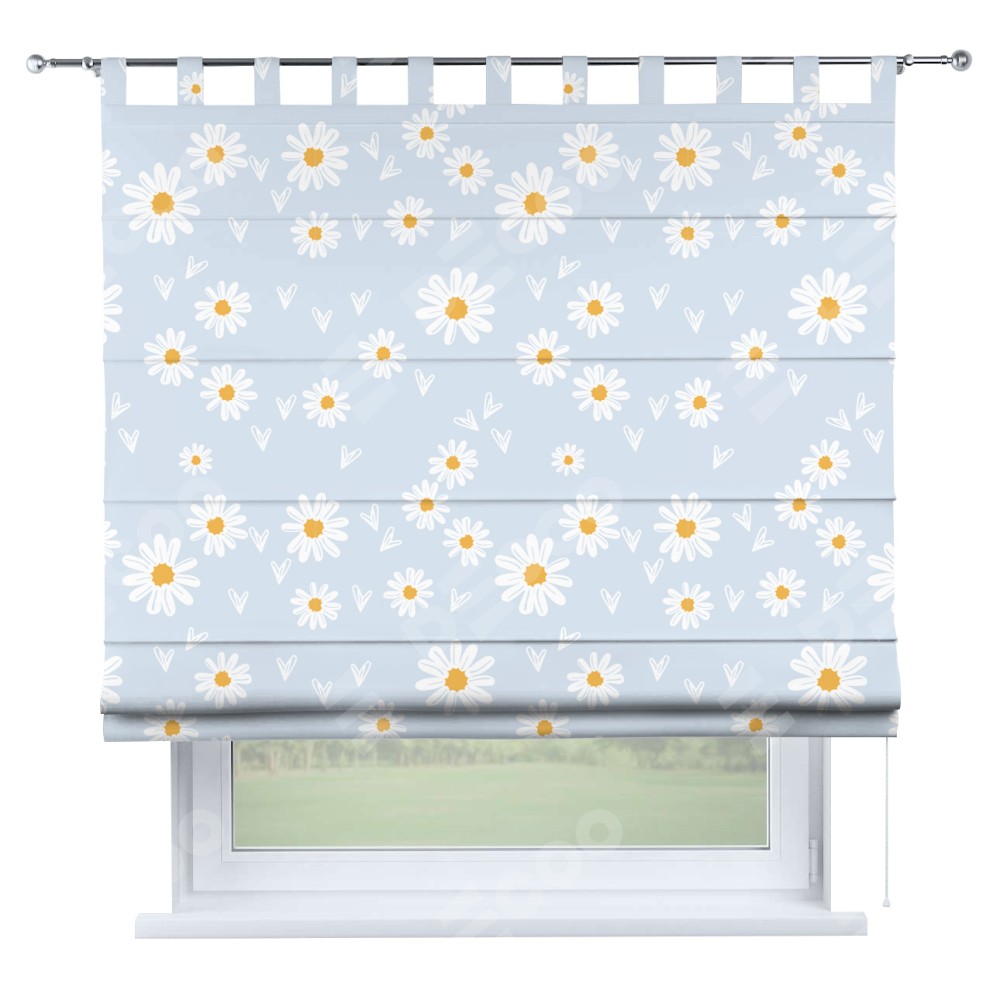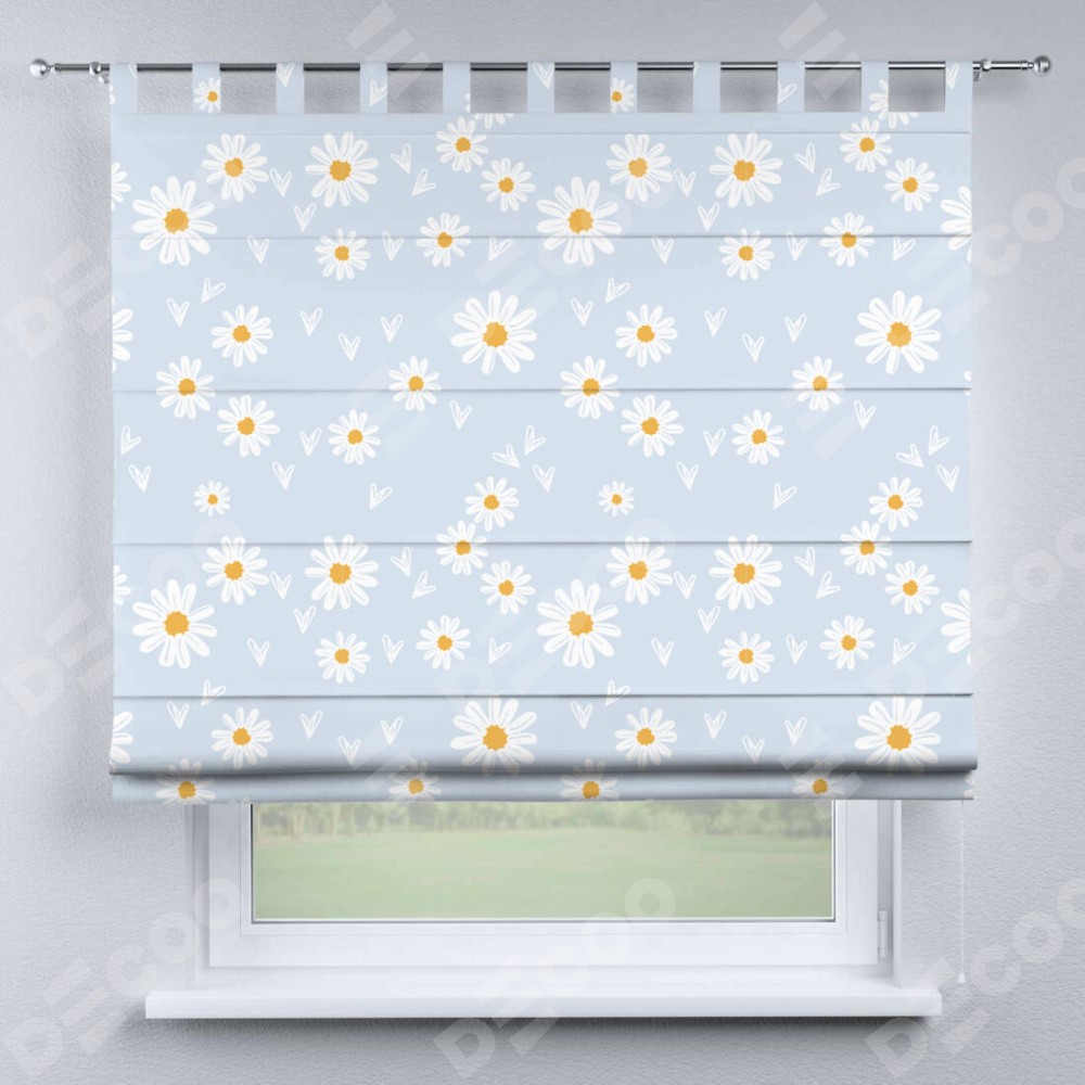 Римская штора производителя «Cortin», используется для проёма, пошита из ткани блэкаут с нанесением сублимационной печати «Летние ромашки». Данная модель пошита на петлях, комплектуется на выбор круглым карнизом и подходит для монтажа на стену. Римская штора на петлях имеет простую систему регулировки высоты, отличительным преимуществом данной модели является простой способ монтажа. Достаточно повесить ее на трубу и штора готова!