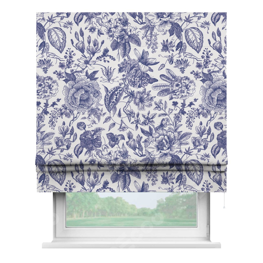 Римская штора производителя «Cortin», используется для проёма, пошита из ткани блэкаут с нанесением сублимационной печати «Прованс в синем». Имеет универсальный механизм и подходит для монтажа: на потолок, на стену и в нишу.