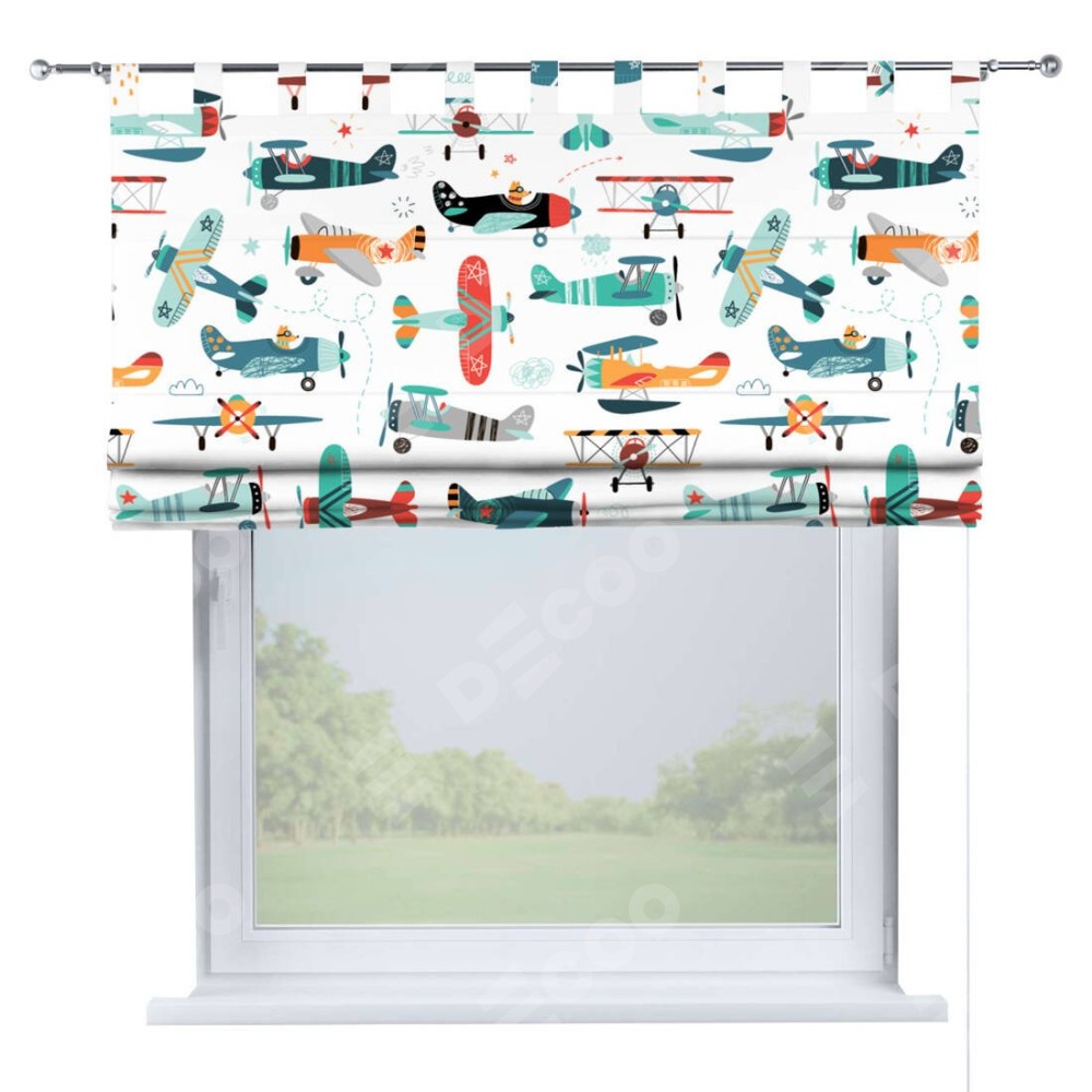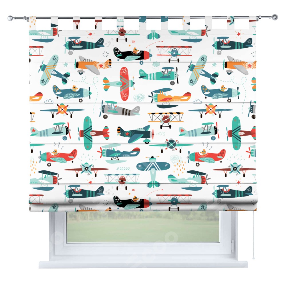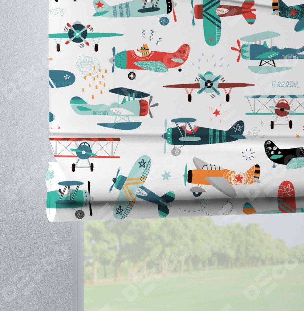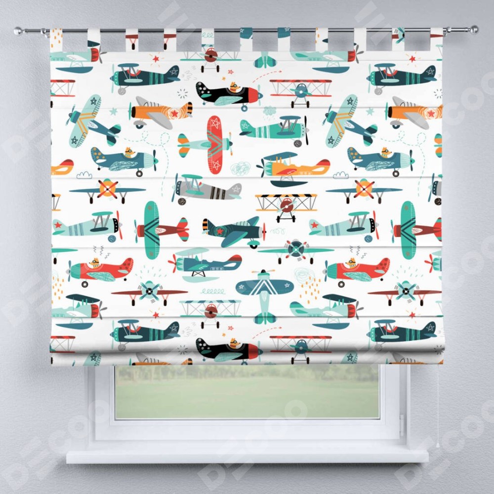 Римская штора производителя «Cortin», используется для проёма, пошита из ткани блэкаут с нанесением сублимационной печати «Самолёты и пилоты». Данная модель пошита на петлях, комплектуется на выбор круглым карнизом и подходит для монтажа на стену. Римская штора на петлях имеет простую систему регулировки высоты, отличительным преимуществом данной модели является простой способ монтажа. Достаточно повесить ее на трубу и штора готова!