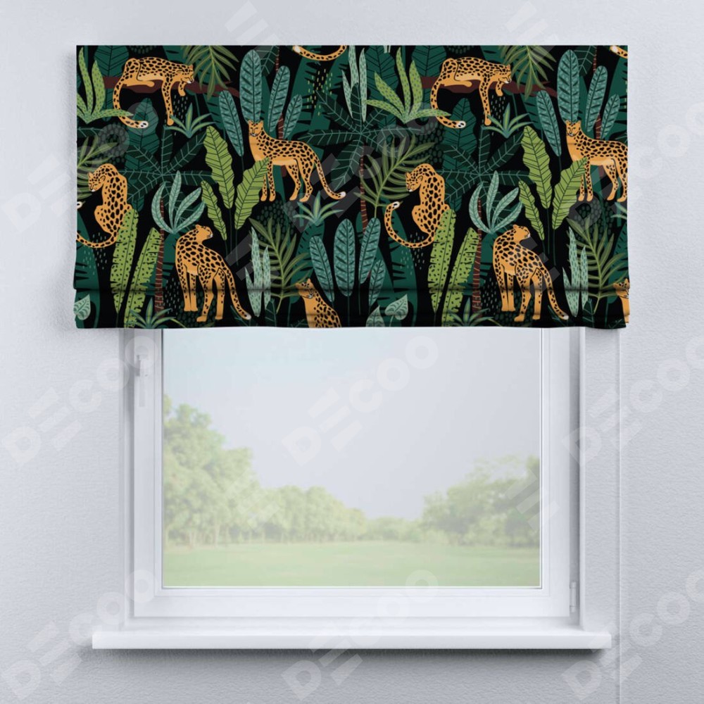 Римская штора производителя «Cortin», используется для проёма, пошита из ткани блэкаут с нанесением сублимационной печати «Леопарды в джунглях». Имеет универсальный механизм и подходит для монтажа: на потолок, на стену и в нишу.