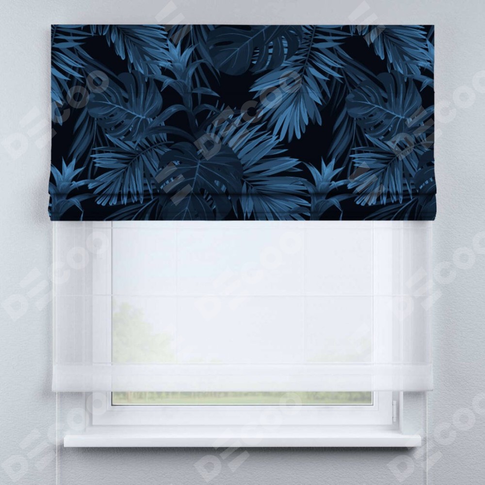 Римская штора день-ночь производителя «Cortin», используется для проёма, пошита из двух полотен, с лицевой блэкаут с нанесением сублимационной печати «Ночные джунгли», вторая ткань тюль (по стандарту комплектуется тюль белого цвета артикул V-01). Имеет универсальный механизм и подходит для монтажа: на потолок, на стену и в нишу.