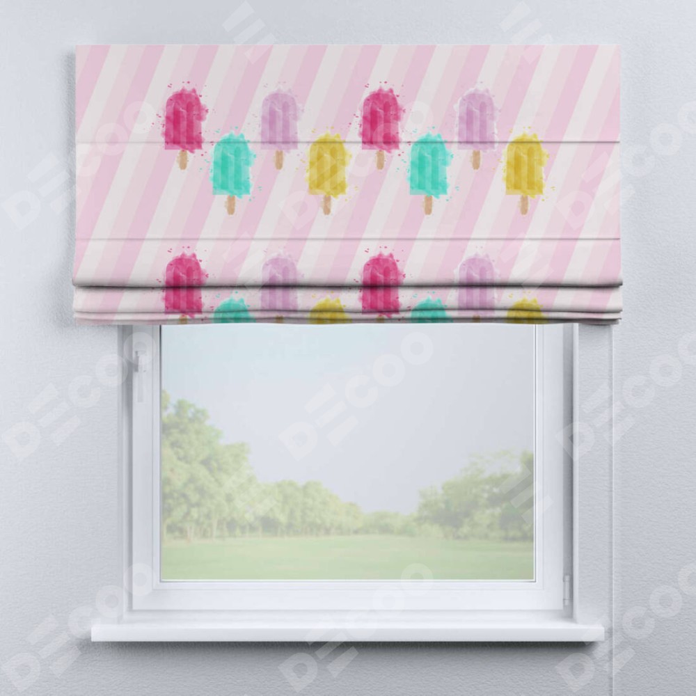 Римская штора производителя «Cortin», используется для проёма, пошита из ткани блэкаут с нанесением сублимационной печати «Фруктовое мороженое». Имеет универсальный механизм и подходит для монтажа: на потолок, на стену и в нишу.