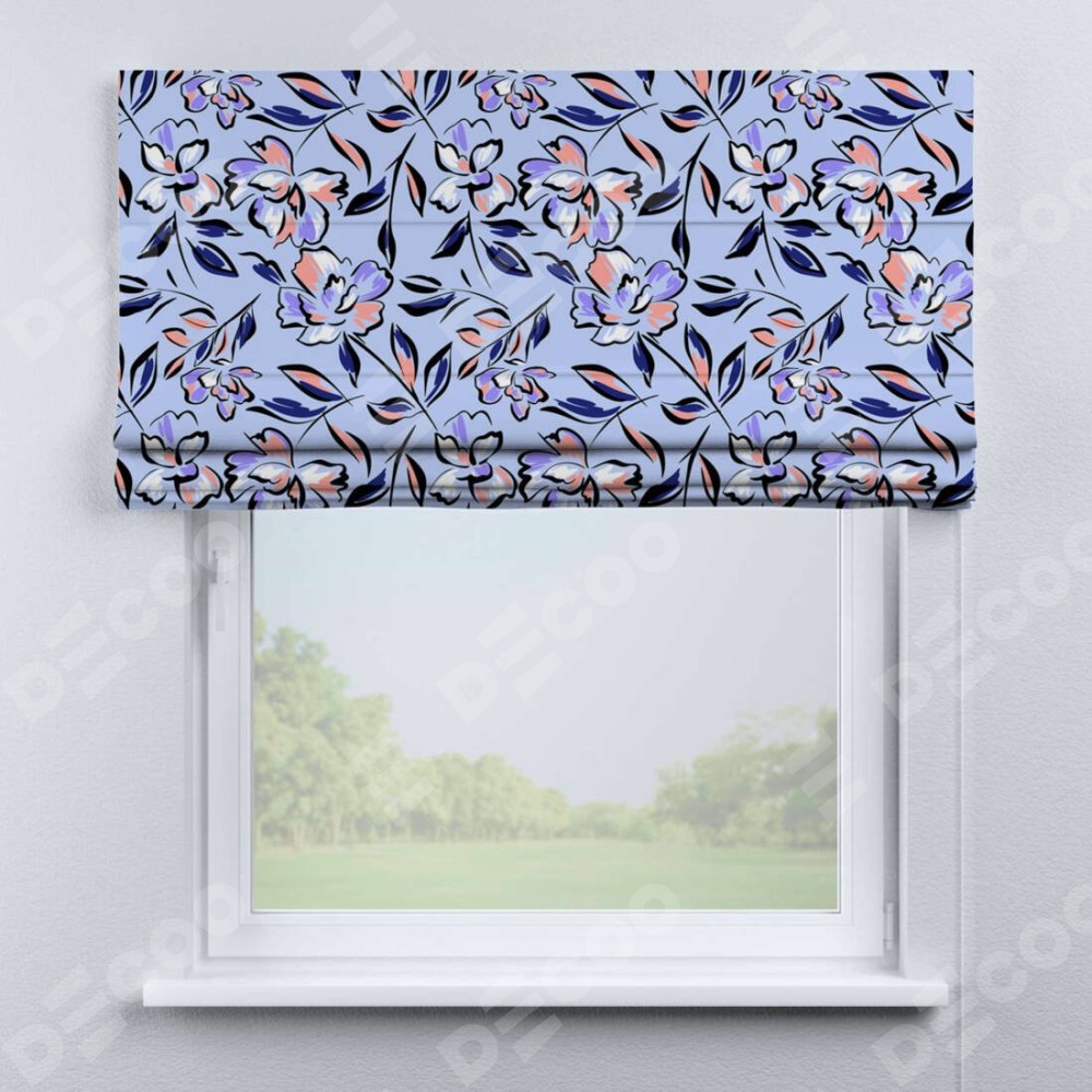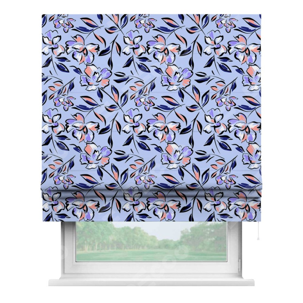 Римская штора производителя «Cortin», используется для проёма, пошита из ткани блэкаут с нанесением сублимационной печати «Цветочки и листочки». Имеет универсальный механизм и подходит для монтажа: на потолок, на стену и в нишу.
