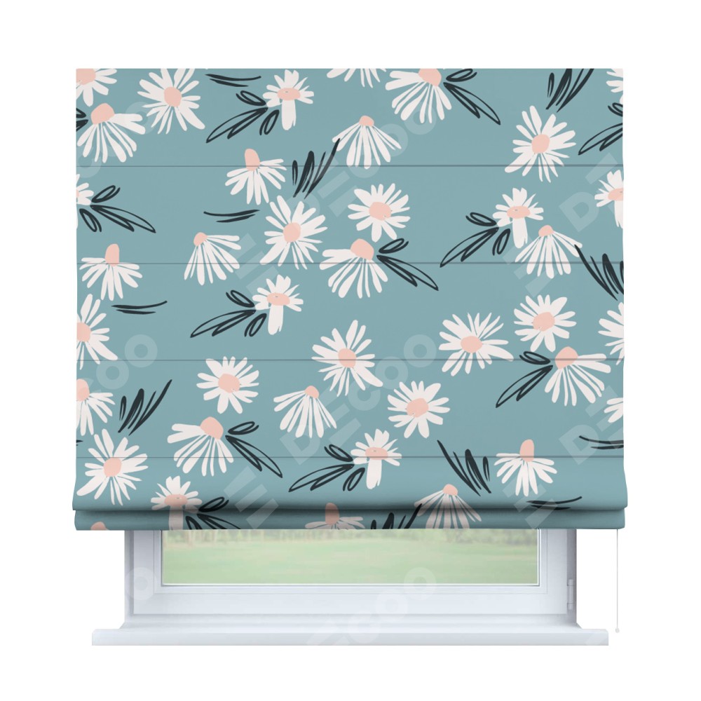 Римская штора производителя «Cortin», используется для проёма, пошита из ткани блэкаут с нанесением сублимационной печати «Чудесные ромашки». Имеет универсальный механизм и подходит для монтажа: на потолок, на стену и в нишу.