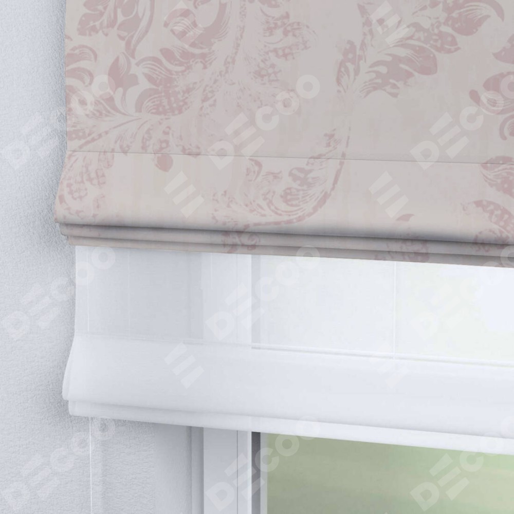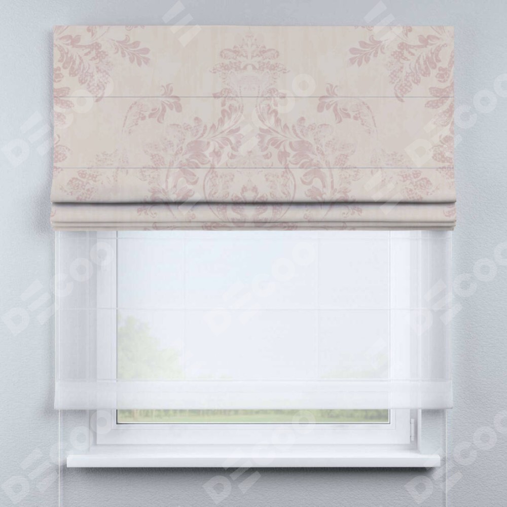 Римская штора день-ночь производителя «Cortin», используется для проёма, пошита из двух полотен, с лицевой блэкаут с нанесением сублимационной печати «Винтажный узор пудровый», вторая ткань тюль (по стандарту комплектуется тюль белого цвета артикул V-01). Имеет универсальный механизм и подходит для монтажа: на потолок, на стену и в нишу.