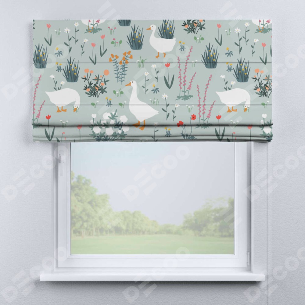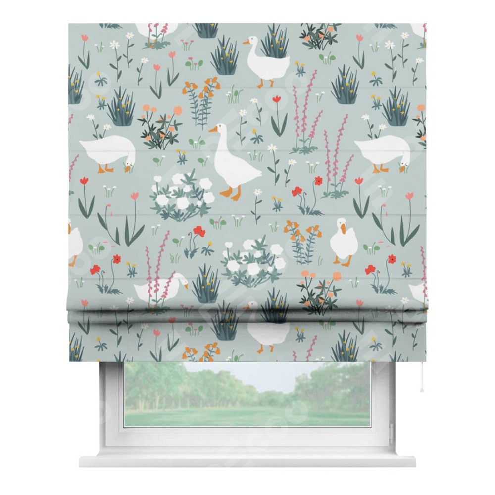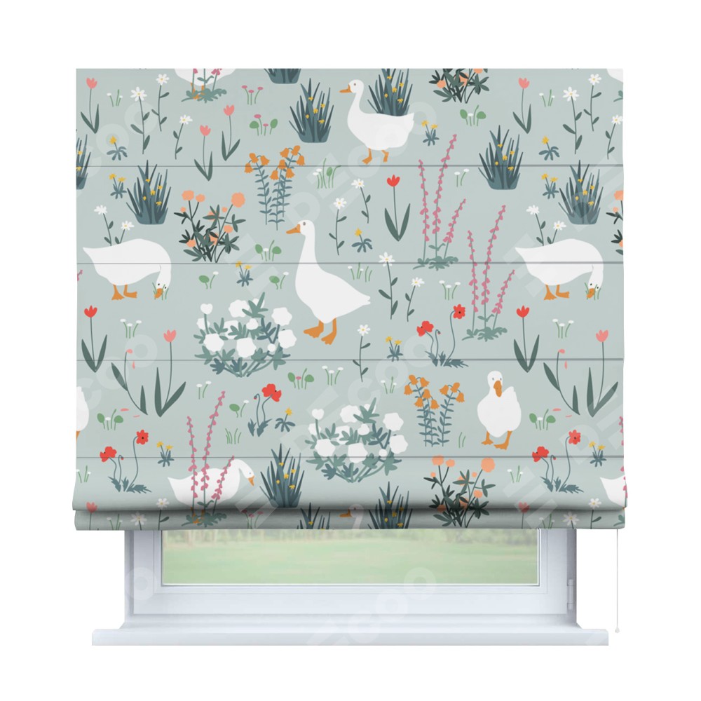 Римская штора производителя «Cortin», используется для проёма, пошита из ткани блэкаут с нанесением сублимационной печати «Гуси на лугу». Имеет универсальный механизм и подходит для монтажа: на потолок, на стену и в нишу.