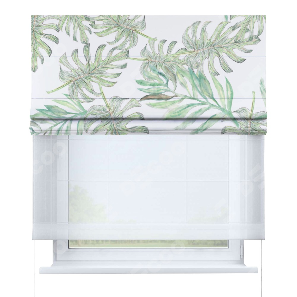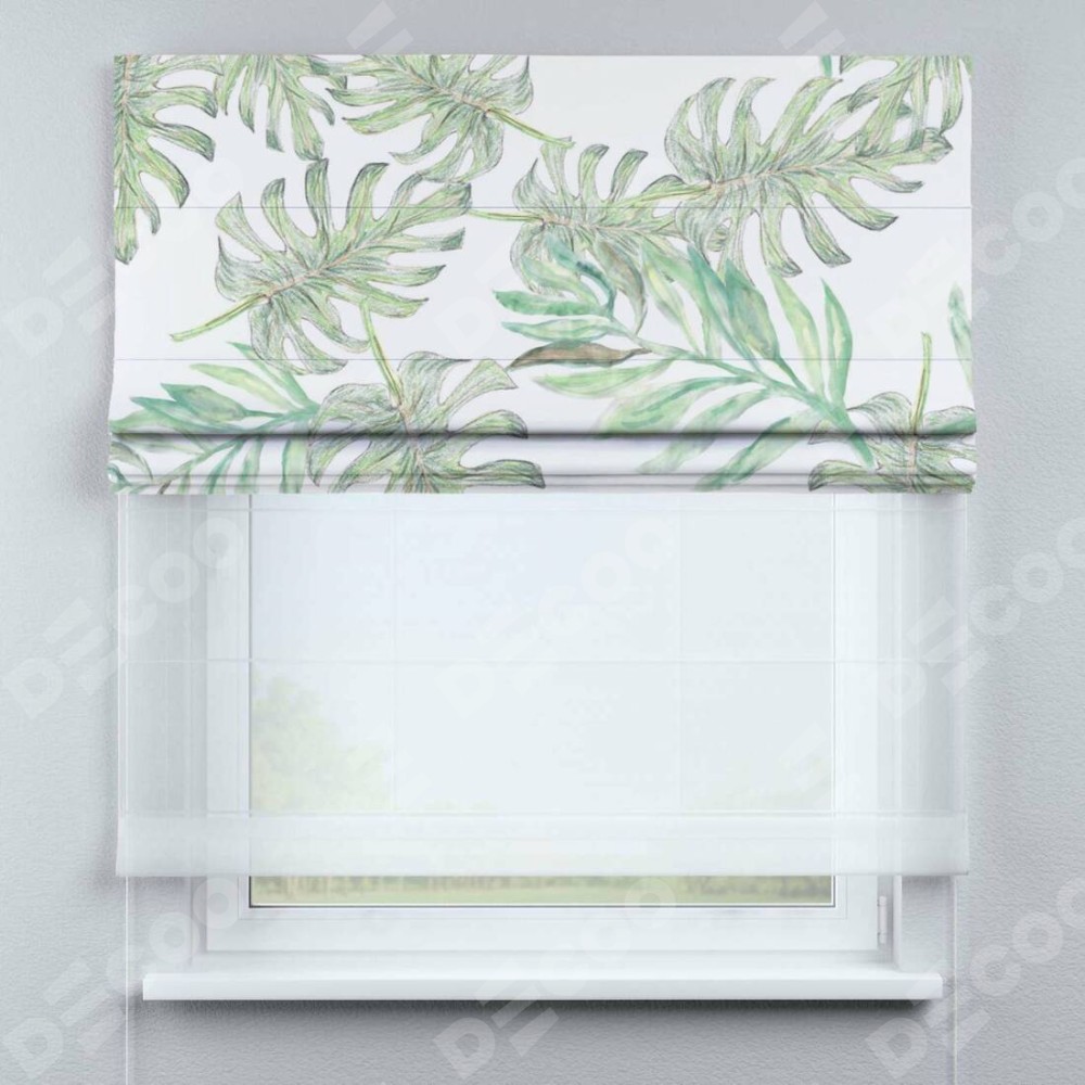 Римская штора день-ночь производителя «Cortin», используется для проёма, пошита из двух полотен, с лицевой блэкаут с нанесением сублимационной печати «Листья монстеры», вторая ткань тюль (по стандарту комплектуется тюль белого цвета артикул V-01). Имеет универсальный механизм и подходит для монтажа: на потолок, на стену и в нишу.